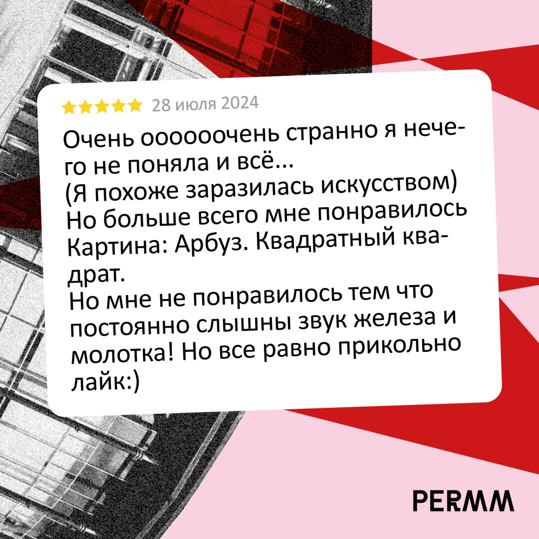 Часто по отзывам в интернете можно сложить мнение о музеях и других культурных институциях и понять, подойдет для вас это место или нет. Но иногда оценки пользователей сами по себе подобны произведениям искусства. Редакция «Прм.Собака.ru» выбрала разные отзывы о пермской галерее, ПЕРММ, «Арт-резиденции» (и не только!) на сервисе Яндекс Карты. Орфография и пунктуация авторов сохранены.