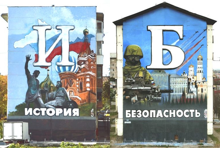 Тенденция снизить общественное недовольство посредством наглядного объяснения, куда движется страна и ее лидер особенно нарастала в кризисные политические моменты. С этой точки зрения, присоединение Крыма к России в 2014 стало настоящим патриотическим художественным прорывом. В конце марта этого года в Москве и Петербурге стартовал проект «Две тысячи домов России», в рамках которого пресловутые две тысячи стен будутукрашены рисунками на пророссийскую тематику. Первый появился уже спустя несколько дней — огромная надпись «Крым и Россия — вместе навсегда» нарисовал на фасаде одного из столичных зданий на Таганской площади Александр Дягилев, экс-участник движения «Наши». Следующей гигатской картиной на улице Александра Солженицына занялись художники, которых Дягилев объединил после городского фестиваля «Лучший город земли» под брендом «ЛГЗ-АРТ».