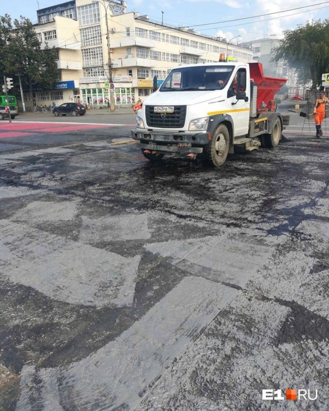 «Супрематический крест» Покраса Лампаса появился на площади Первой Пятилетки в жилом районе «Уралмаш» — соцгород в стиле конструктивизм создавался в 20–30-е годы прошлого века. Плитка на этой площади уже давно имеет форму креста — ее художник обыграл в своей каллиграфии.