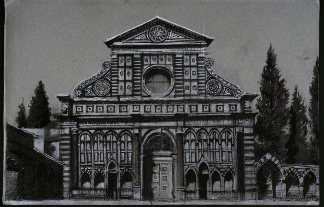 Одно из первых зданий, встречающихся на пути с главного железнодорожного вокзала Флоренции, — церковь Санта-Мария Новелла, но немногие сразу ее узнают с торца. Большинство много раз видели на изображениях ее главный фасад, спроектированный Леоном Баттиста Альберти, выходящий на широкую площадь и ставший одним из самых тиражируемых флорентийских видов. За его тщательно продуманной геометрией прямых углов, пилястр, волют, большого круглого окна в верхней части и арочных в нижней скрывается типичный итальянский хаос. Первыми авторами самой большой флорентийской церкви были монахи владевшего ей доминиканского ордена Фра Систо Фьорентино и Фра Ристоро да Кампи. Санта-Мария Новелла строилась больше века и внутри представляет собой глубокое, чуть темное, аскетичное в деталях пространство. В многочисленных капеллах в разное время оставили свои работы Мазаччо, Лоренцо Гиберти, Филиппино Липпи, Паоло Уччелло, Сандро Боттичелли, так что вполне хватило бы на небольшой музей. Великий Брунеллески сделал для Санта-Мария Новелла одну из немногих своих скульптур, распятие, и спроектировал кафедру, с которой впервые прозвучали обвинения в адрес Галилео Галилея. Однако весь этот сложнейший лабиринт великих и отчасти зря забытых мастеров остался лишь дополнением к совершенному в своей простоте фасаду. Глядя на него с площади, мы едва можем вообразить, что за здание он прикрывает собой. Когда занавес слишком хорош, он затмевает собой разыгрываемое за ним действо.