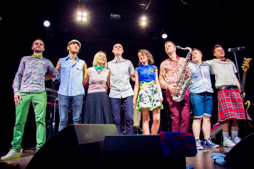 После съемок нас обычно ждет автобус, мы едем на концерт, где наши звукорежиссеры уже провели саундчек. Мы приезжаем на площадку, когда мероприятие в самом разгаре, пьем чай, наш администратор Юля помогает погладить костюмы и переодеться. Известная шутка гласит: каждый коренной москвич очень скучает по своей истинной родине. И это правда. Москва, по сути, и есть коллективный портрет страны. Нас приглашают выступать перед огромными компаниями, работники которых съезжаются со всей России, и это наши самые крутые концерты. Перед нами собираются люди с открытым сердцем, они мгновенно ловят эмоцию и реагируют на нее. Нам повезло, что группа «Фрукты» начала свой путь с корпоративов в ресторанах сети Probka Family. Иначе мы не стали бы теми, кто мы есть: не были бы такими веселыми, не выплескивали бы так открыто энергию, если бы когда-то не пытались завоевать людей, глядящих в тарелки. Я бы советовала всем музыкантам пройти этот этап. Проблема многих проектов, например вышедших из шоу «Голос», не только в отсутствии репертуара, а именно в пропасти между артистом и зрителем. Мы же изначально сидели практически на коленках у гостей, смотрели им в рот и ненавязчиво старались быть им интересными. А недавно мы выступали в московском клубе Yota Space, забитом до отказа, и стало ясно: нет разницы — петь перед столом на шесть человек или же перед беснующейся толпой. Это как в управлении бизнесом: если ты научишься руководить шестью работниками, сможешь управлять сотнями и тысячами. После часового выступления мы на полчаса зависаем в гримерке. Иногда нас гонят, потому что скоро придут другие артисты, а для нас это единственное время, когда можно просто расслабиться, никуда не бежать, не решать семейные вопросы. Наш саксофонист Костя перевез семью в Москву, ему так удобно. У перкуссиониста Диего дочь постарше, у нее хорошая школа здесь, поэтому семья осталась в Петербурге. Все мы в каком-то смысле моряки дальнего плавания.
