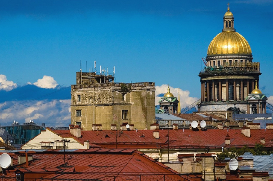 Днем — съемка и интервью для вашего журнала «Собака.ru» в качестве номинантов премии «ТОП 50». Мы карабкаемся на крышу ДК работников связи на набережной Мойки — вид потрясающий.