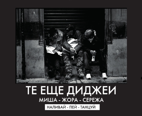 В пятницу 21 октября в SOHOLOUNGE на Конюшенной площади будет представлено московское трио «Те еще диджеи». Москвичи Сергей Минаев, Михаил Семиз и Георгий Павленишвили, уже состоявшиеся в немузыкальных сферах личности, теперь собирают своих друзей в барах Москвы. Они закрывают двери, встречают по спискам и играют музыку, которую слушают сами, от Rolling Stones до Богдана Титомира.