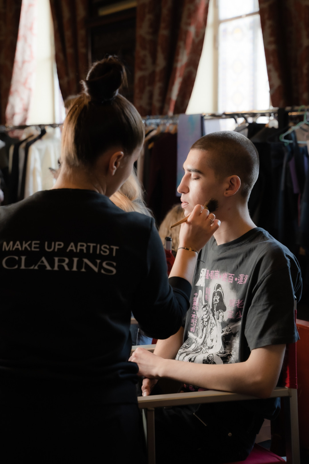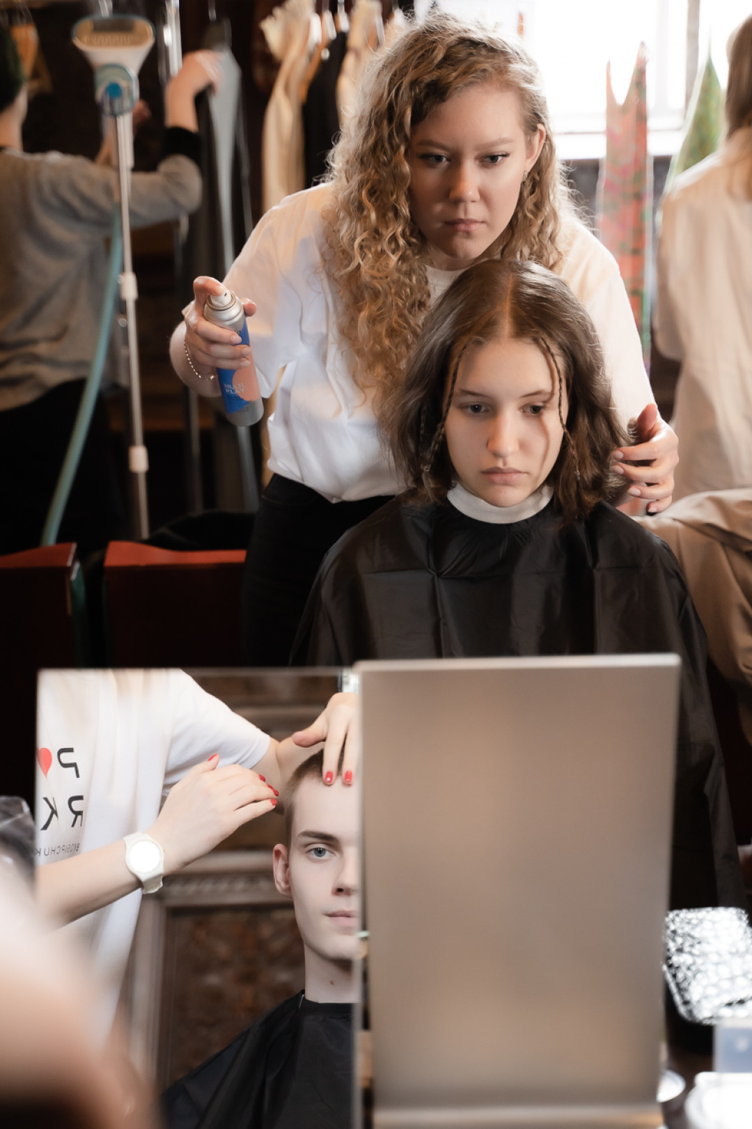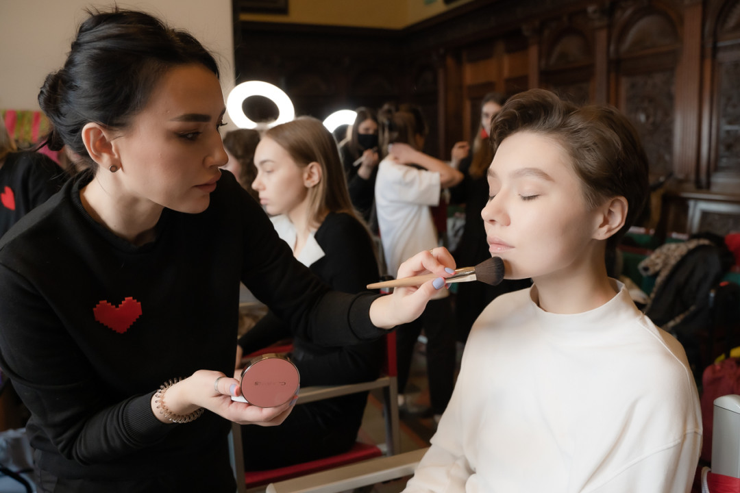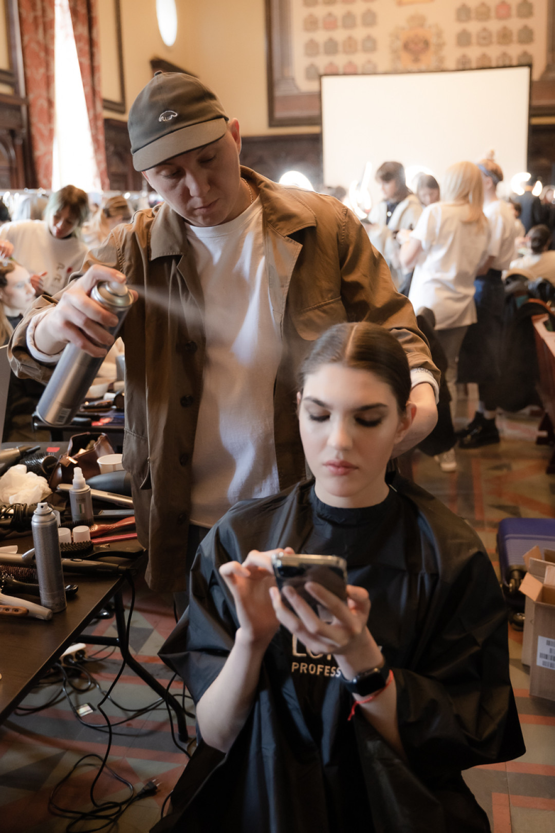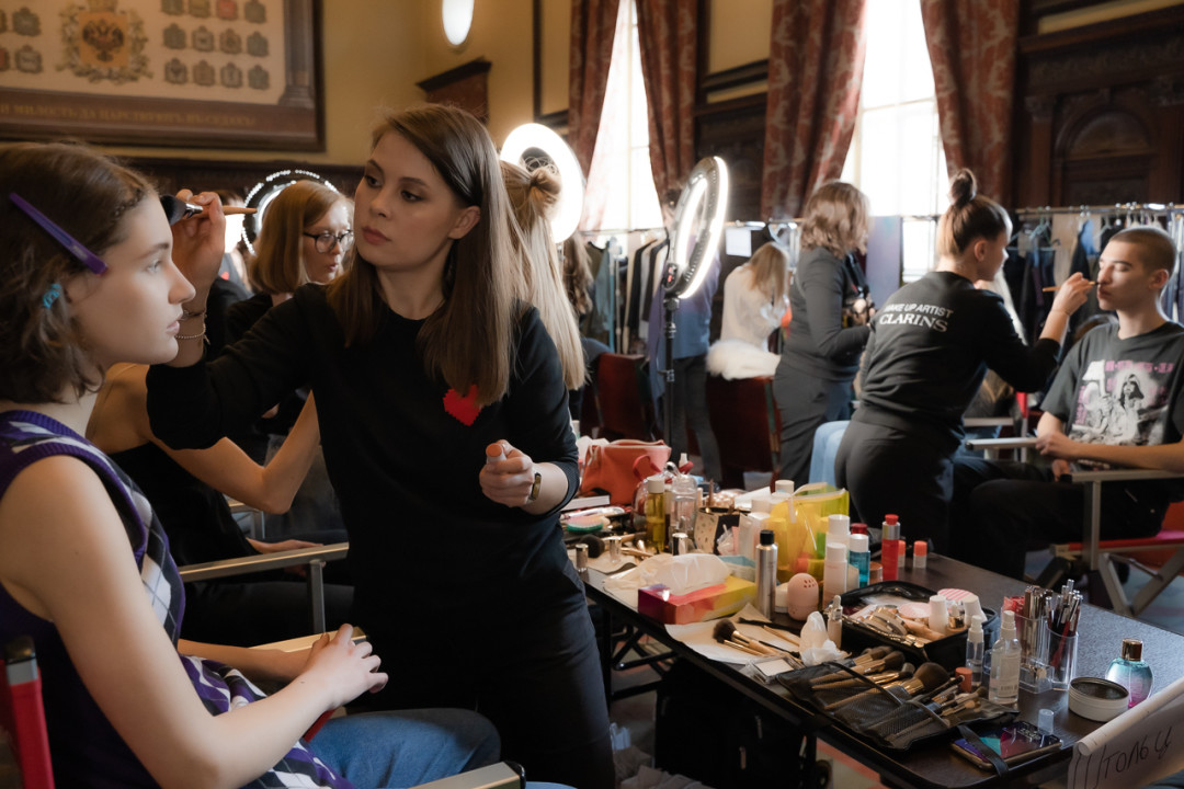 Над показом, ставшим важным и большим событием для наших победителей — молодых дизайнеров, потрудилось немало крутых профессионалов. Среди них — режиссер-постановщик Сергей Луковский, стилисты бренда профессионального ухода за волосами Londa Professional и студии PARK BY OSIPCHUK, визажисты легендарного косметического бренда Clarins и наши партнеры — сеть премиальных магазинов парфюмерии и косметики РИВ ГОШ, которые также познакомили гостей мероприятия с ароматом Cheeky Smile от итальянского парфюмерного дома Jusbox (аромат эксклюзивно представлен в сети РИВ ГОШ и Rivoli Perfumery). Все визажисты и стилисты, а также десятки моделей, собрались в зале академии Штиглица, который на день превратился в гримерку и костюмерную. С раннего утра шла масштабная и скрупулезная подготовка образов, некоторые из которых потребовали три-четыре часа работы!