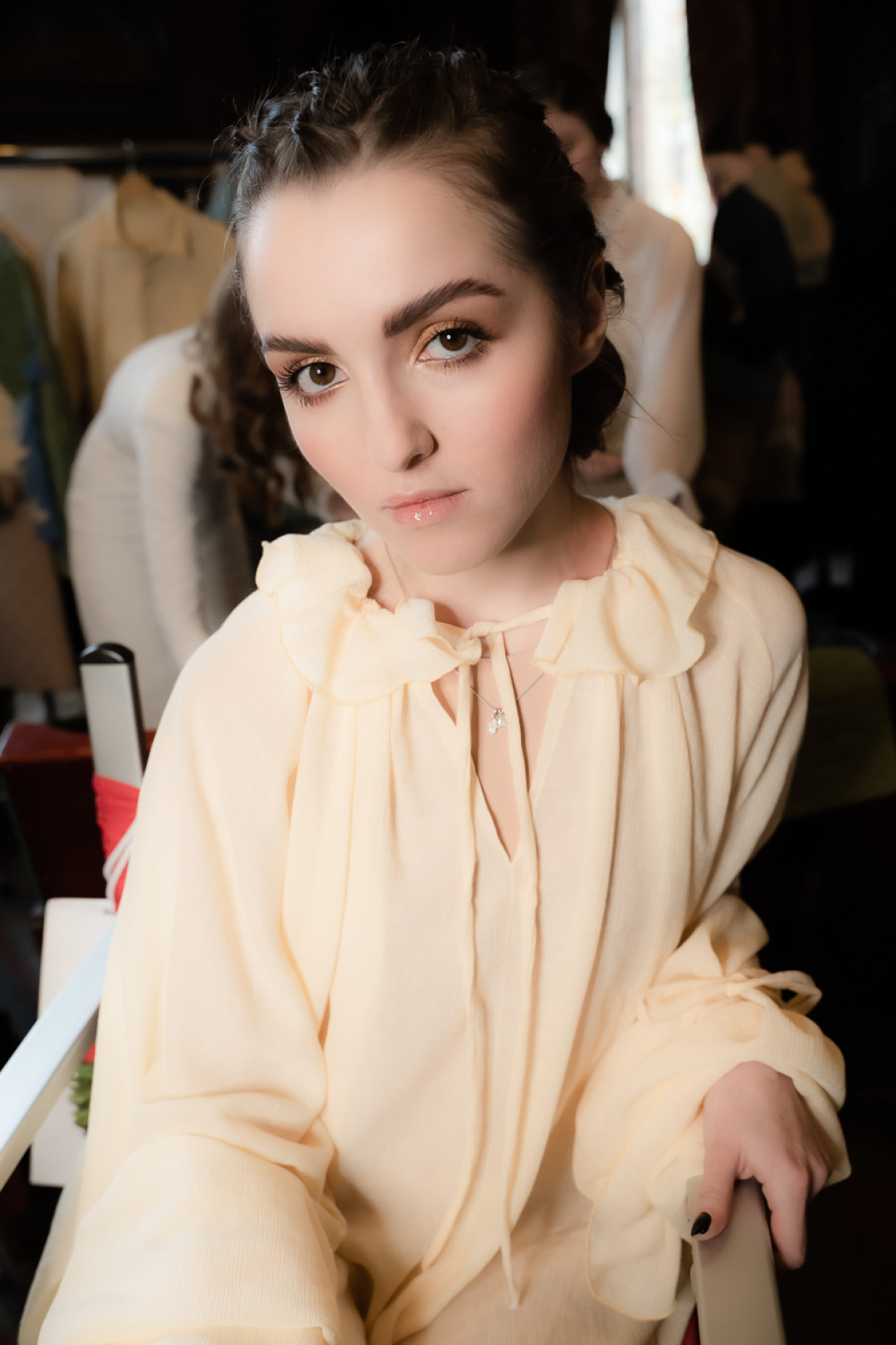 Перед стартом шоу в нашей импровизированной гримерке градус напряжения становится выше: визажисты и парикмахеры добавляют в образы финальные штрихи, дизайнеры волнуются (для многих из них такой показ стал первым), отпаривают вещи из своих коллекций уже прямо на моделях, сами готовятся к собственному выходу на подиум в финале шоу. И вот — музыка, софиты, переведенные в режим «видео» телефоны гостей — показ «Новые имена в моде-2021» начался!