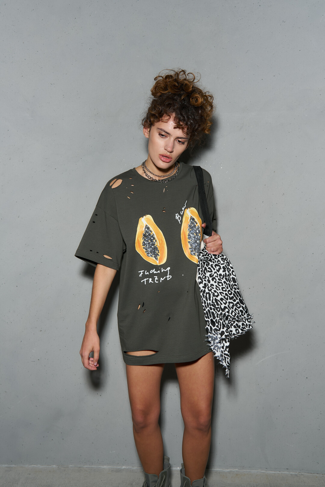 Изначально бренд задумывался как гранжевый. Я понимал, что с целой коллекции начинать не хочу — не было ни финансов, ни поддержки. Купил специальное печатное оборудование, заказал в Екатеринбурге партию футболок. Пришли бракованные. Еще и ткань была плохая. Я вернул их и заказал новую партию. И снова брак! А время шло — только месяц потратил на заказ и возврат, и деньги кончались. Ждать уже было невозможно, поэтому я просто напечатал рисунки на рваных футболках, а уже имеющиеся дырки сделал больше. Протестировал на нескольких: получилось необычно, таких я ни у кого не видел. Так и вышло, что рваные футболки, оказавшиеся случайностью, стали частью нашей концепции. Они были и будут у нас всегда!