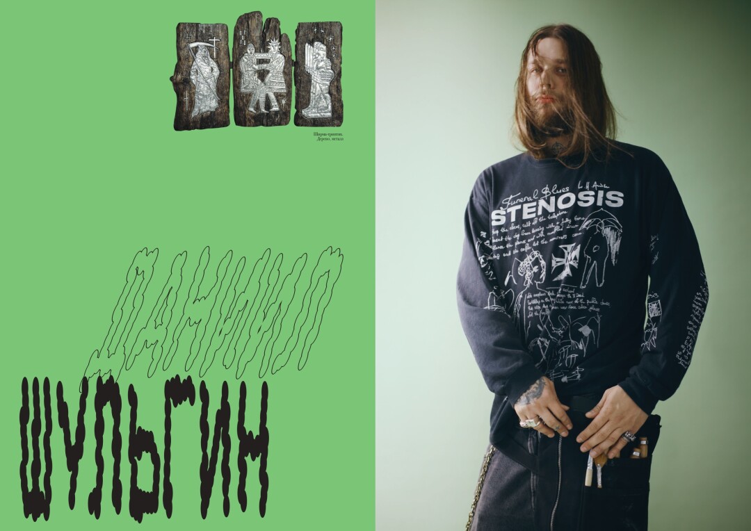 Даниил (Шуля) Шульгин — кофаундер панк-бренда Stenosis, звезда графического дизайна с уклоном в трэш-эстетику, диджей и древесный художник. Пока вы (вслед за Викой Салават и Машей Миногаровой) коллекционируете его макабрические лонгсливы, он уже пилит ширмы-триптихи со смертью, солдатами любви и вулканическими армянскими мужчинами.
