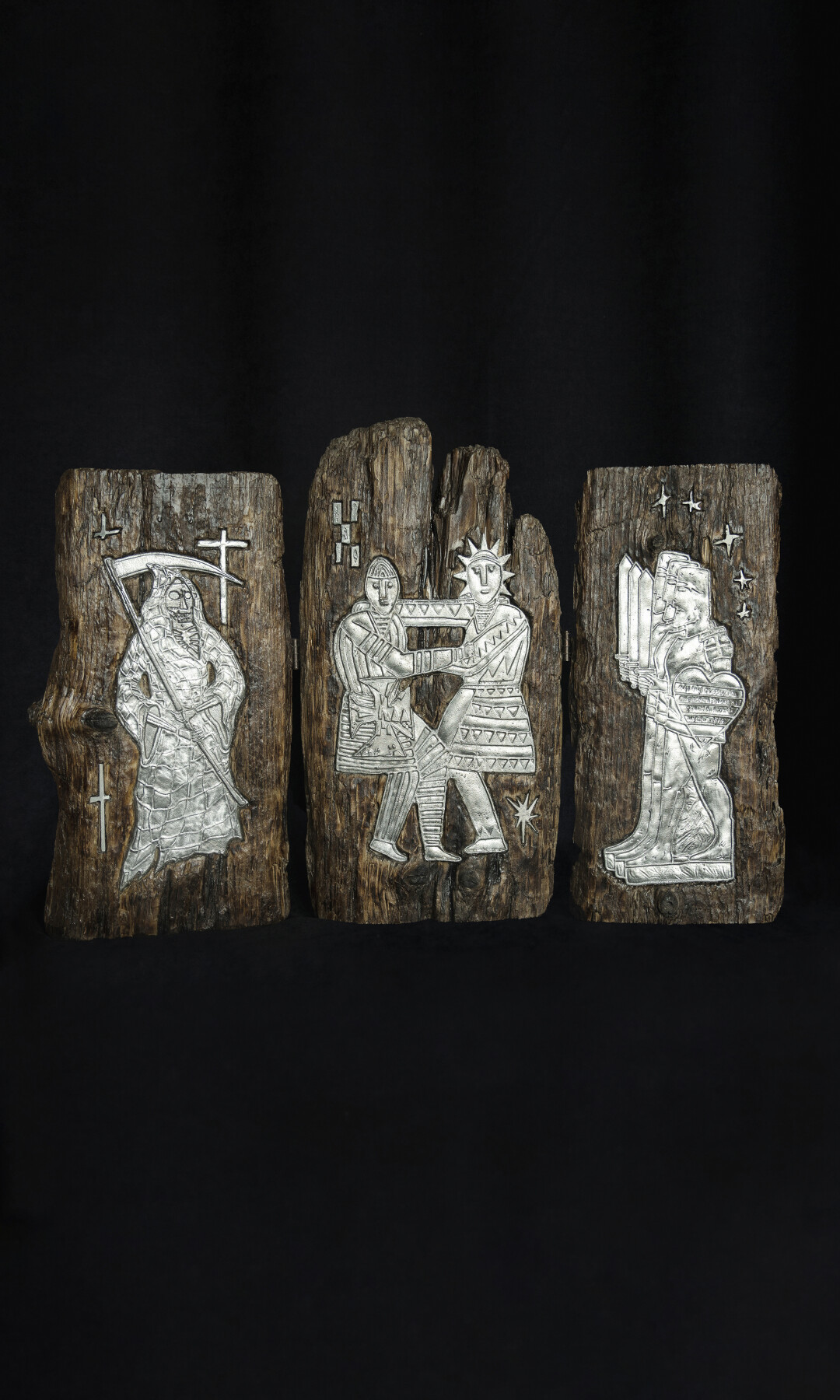 Кратко: нигде. Только на картинках в интернете: все сразу раскупается. Из последнего — ширма из дерева и железа. Там чеканка по песку, чтобы был эффект винтажа. Это по сути триптих из фрагментов разных культур. Одна из фигур, например, — моя трактовка армянской скульптуры из туфа — из ереванской Национальной галереи.