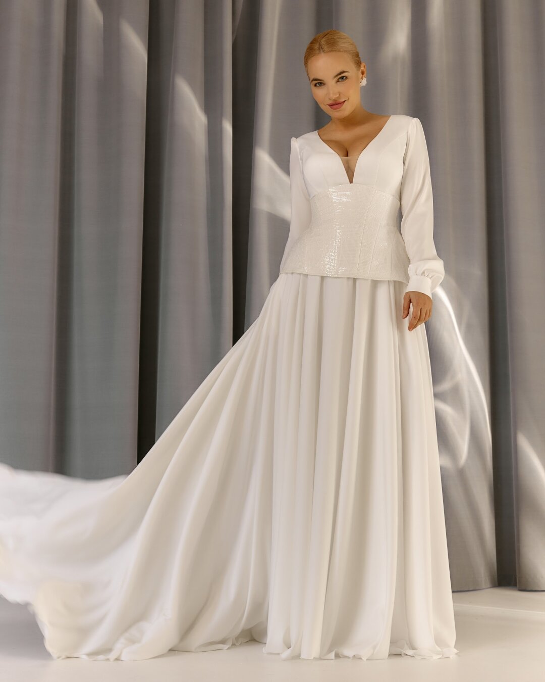 Сейчас популярна история с двумя нарядами: первое пышное, со шлейфом, для церемонии, второе — удобное, мобильное для банкета. В нем можно спокойно ходить, есть, танцевать, а потом уехать в свадебное путешествие.