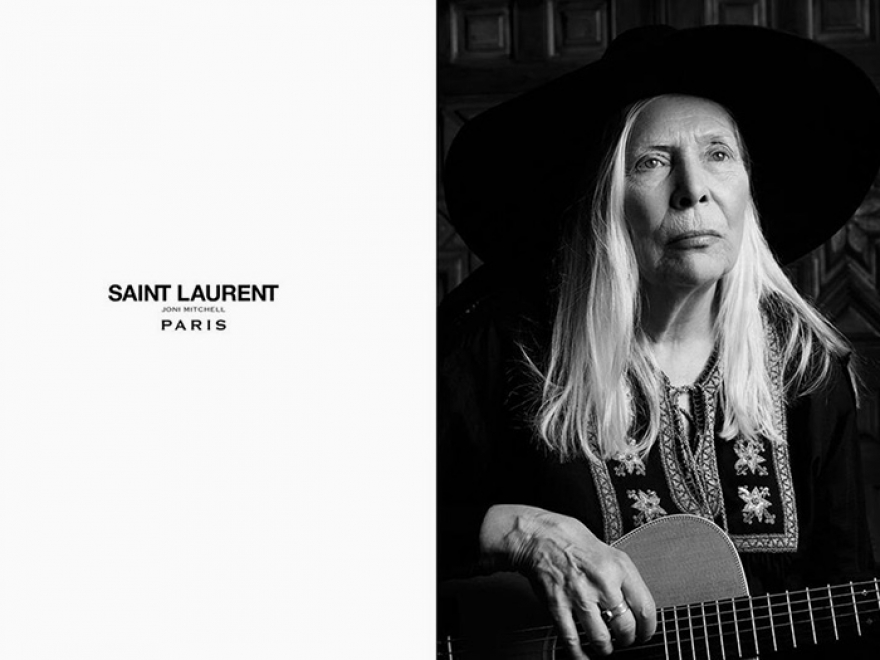 Тенденция к принятию возраста в фэшн-индустрии продолжилась и в новой рекламной кампании Saint Laurent — ее героиней стала канадская фолк-певица Джони Митчелл, которой исполнился 71 год. На черно-белых снимках, сделанных в доме Митчелл в Лос-Анджелесе, певица в тунике из новой коллекции и широкополой шляпе из кожи позирует с гитарой. Здесь Эди Слиман явно обыграл тех, кто последние два года винил дизайнера за тинейджерские наряды стоимостью 30 000 евро.
