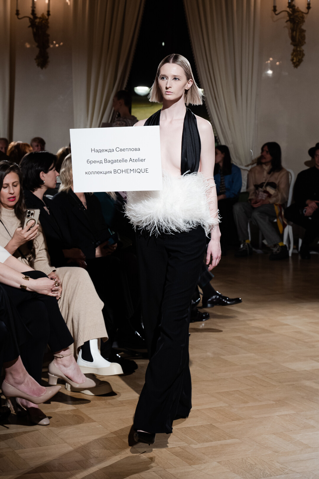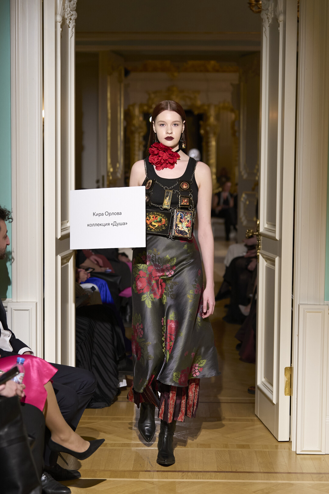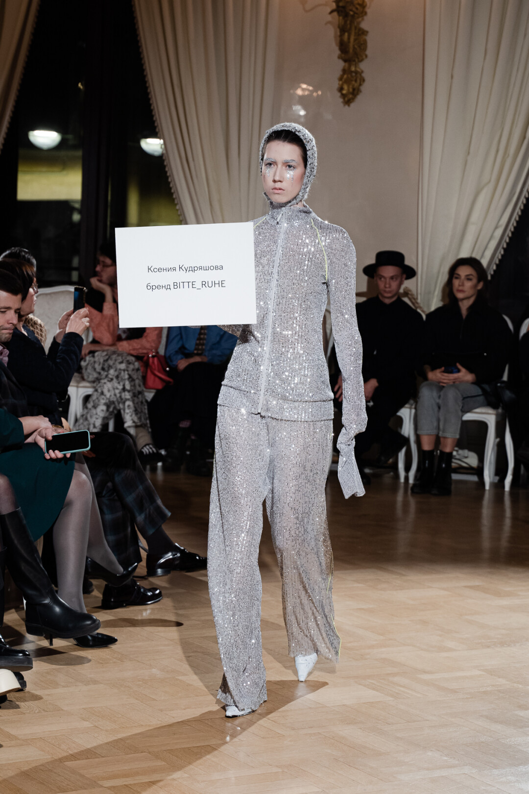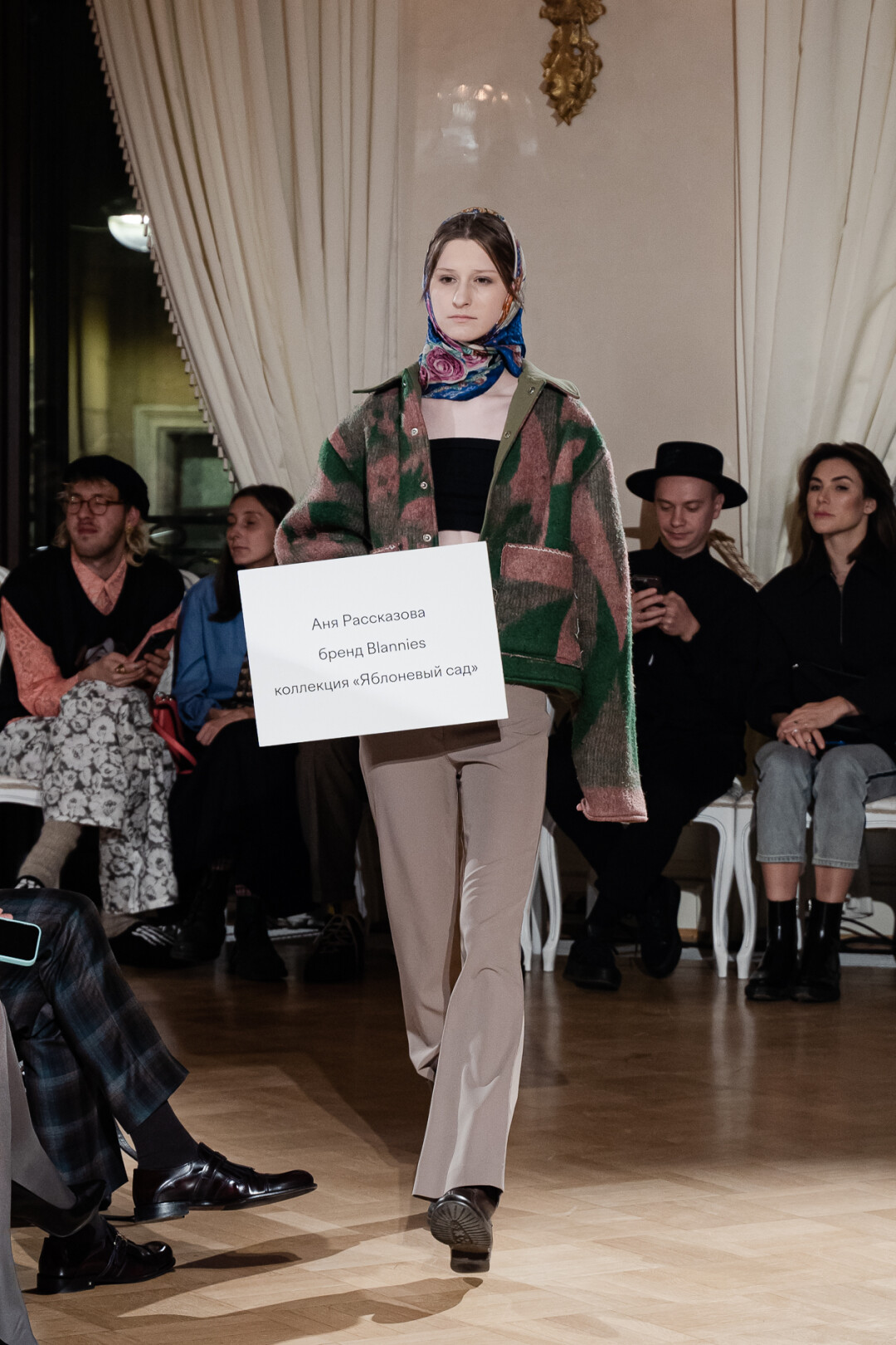 Любимые герои «Собака.ru» вышли поддержать юные дарования дрим-составом: Юлдус Бахтиозина дефилировала в характерном оперении Bagatelle, Виктория Портфолио – в искрометном чепце, приспущенном платье и стеганой баске оттенка пыльной розы BITTE_RUHE, Полина Сидихина примерила интеллектуальную (работает как SPF), но суеверную (купальники-обереги) пляжную одежду RoDaSoleil, а Екатерина Смольникова выбрала кавайно-няшные вещи в жанре трэш-манги дизайнера Алины Соткиной. Лиза Гусевская укрылась советским одеялом-курткой от Ани Рассказовой, а Евгения Сероусова прошлась в прозрачном силиконе авторства Софьи Тихоновой. Срежиссировал происходящее Сергей Луковский, а стилизовала показ (и эффектно выступала в цветочном кэтсьюте Насти Соломеиной) Эльмира Тулебаева. Было модно!