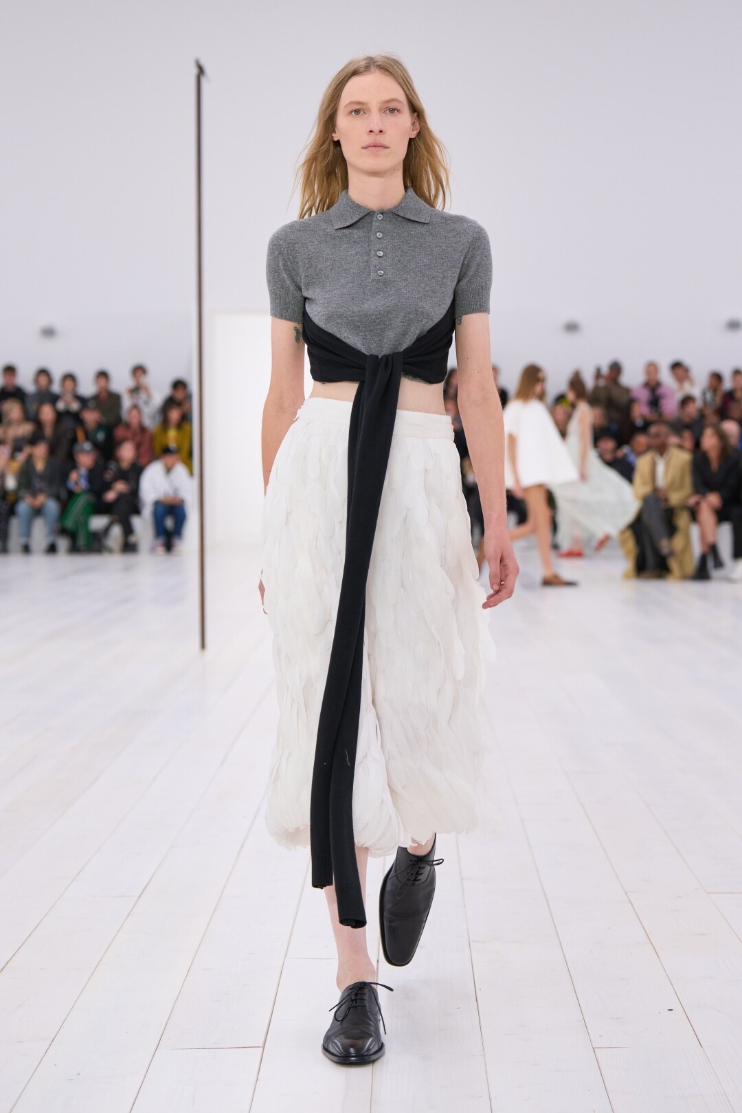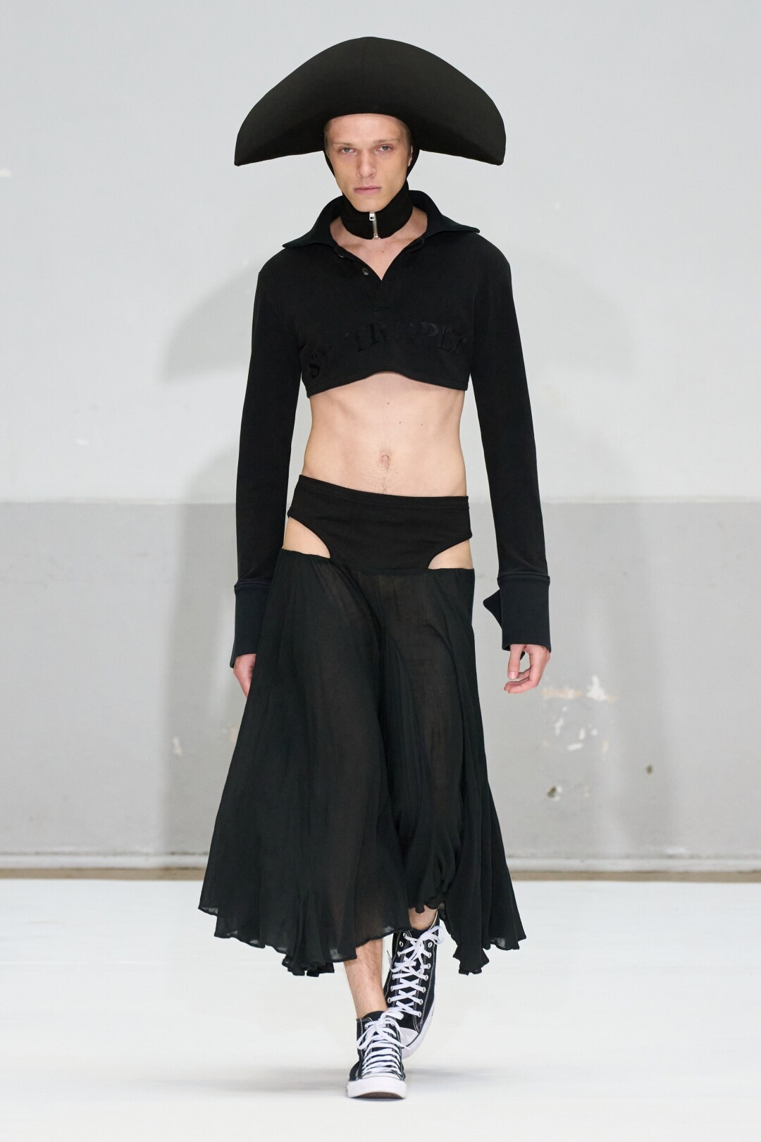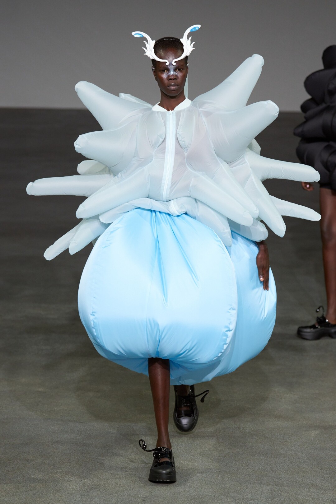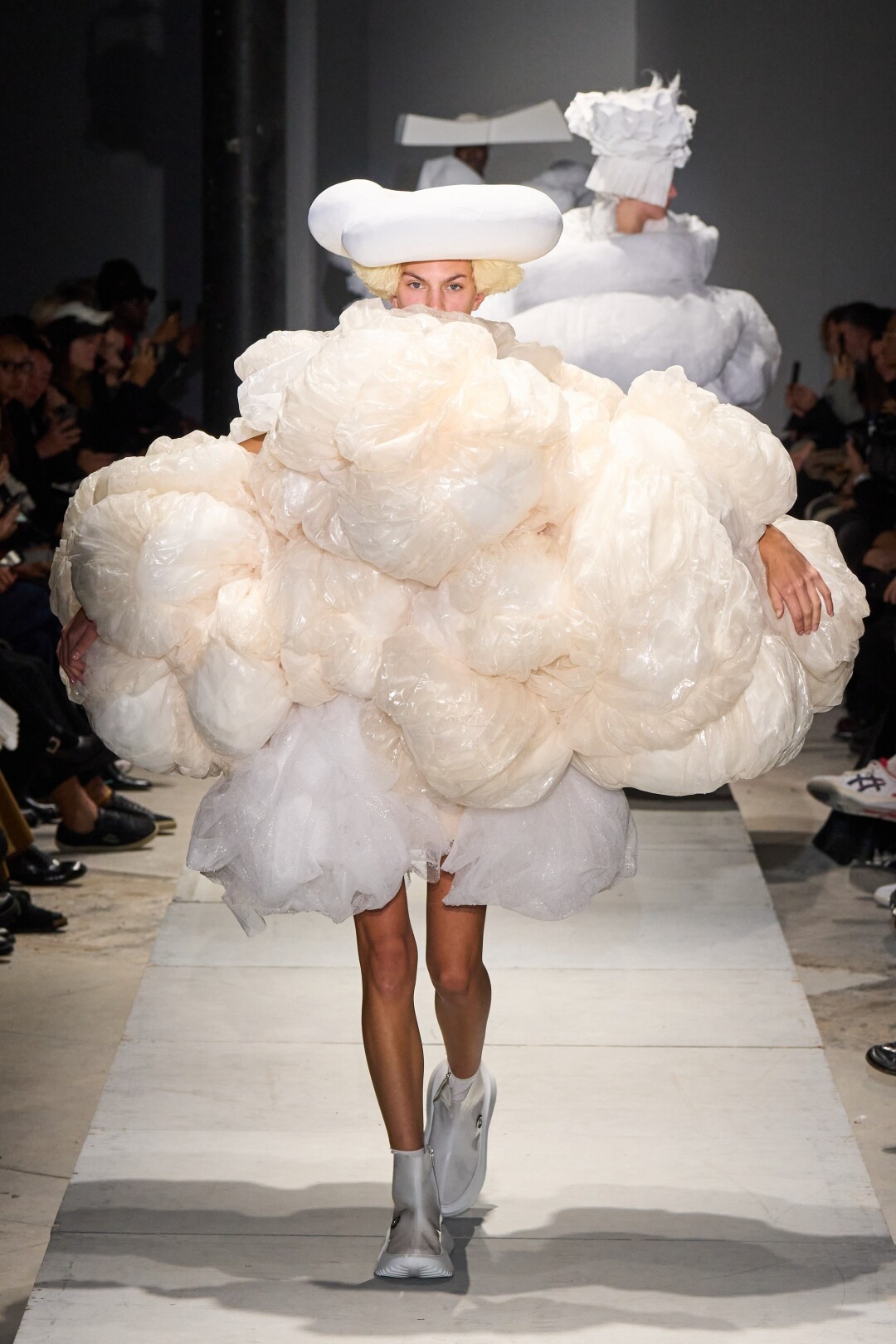 Оверсайз сдает позиции в кэужал-гардеробе, но точно не в фэшн-сюрреализме — здесь креативные директора солидарны с депрессивным вайбом endcore с показа Miu Miu и настойчиво прячут нас в коконы, спасая от окружающего мира. Можно притвориться облачком Comme des Garçons, котелком Noir Kei Ninomiya или юбкой-НЛО JW Anderson — а из более базовых вариантов предусмотрены кейпы, ориенталистские шаровары и блумерсы, которые все чаще появляются на подиуме (а следом — в луках модных инфлюэнсеров).