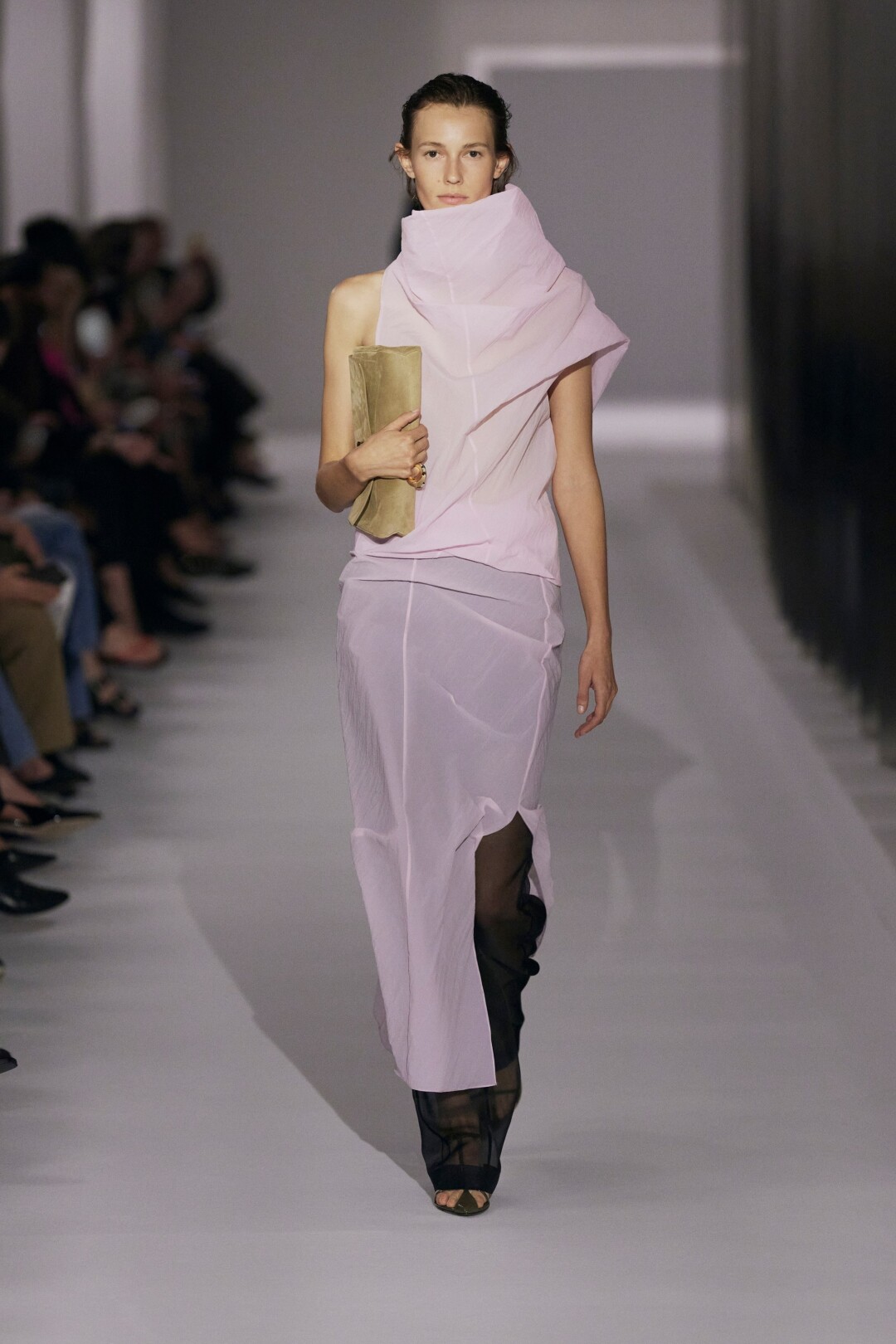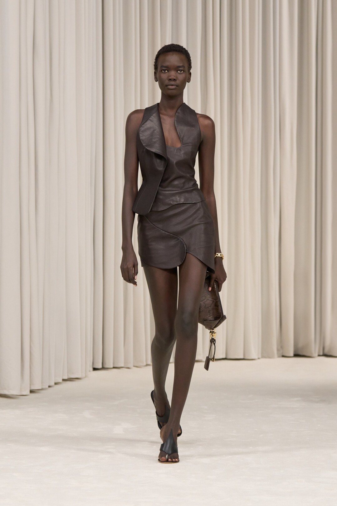 Приручив драпировки, модные дома обратились к асимметрии — так получились сложносочиненные платья Gucci и Ance Studios, которые можно носить как с сапогами, так и с туфлями с открытым мысом (обувной мастхэв сезона). С подачи Loewe и Khaite оголяем одно плечо (чтобы украсить руку акцентным браслетом), примеряем ассиметричные костюмы Balmain и лихо экспериментируем с формами лацканов тренчей (успешность фэшн-трюка гарантирована Матье Блази из Bottega Veneta).