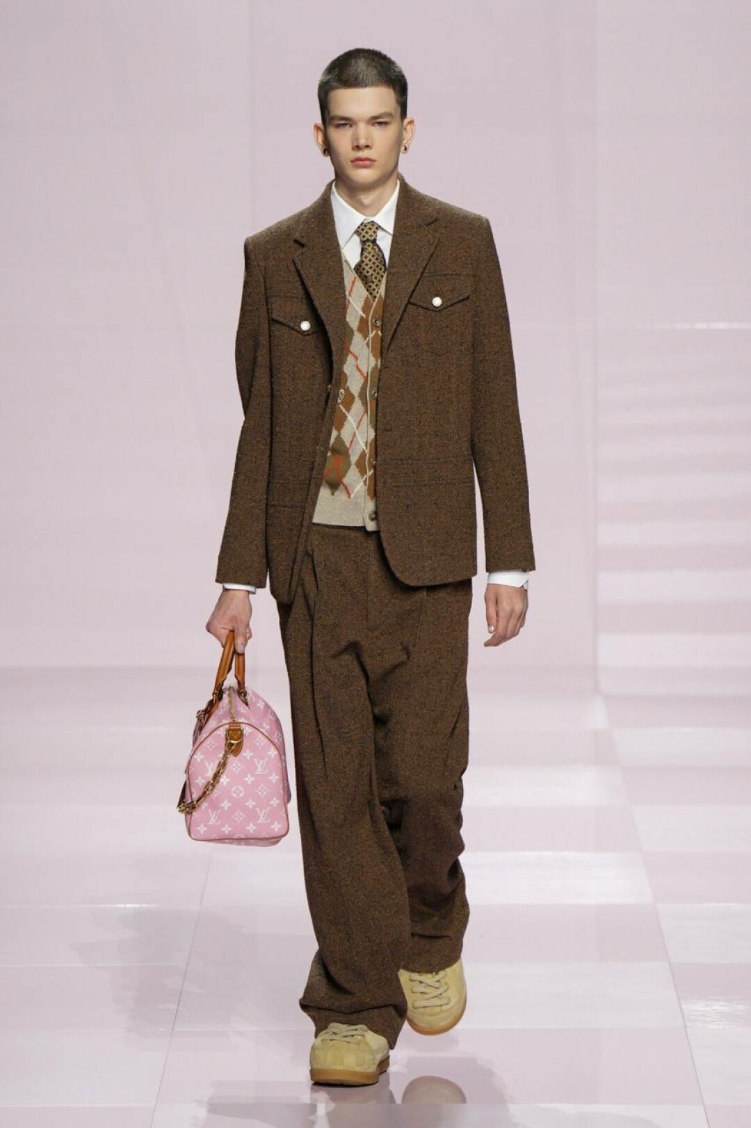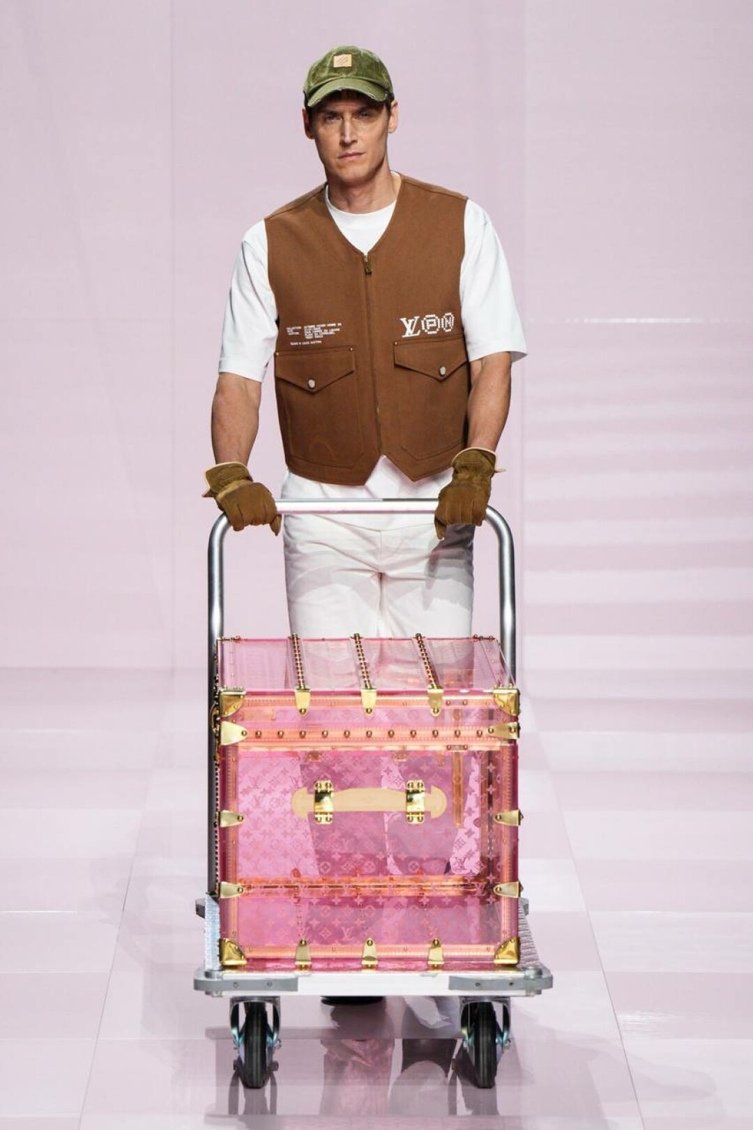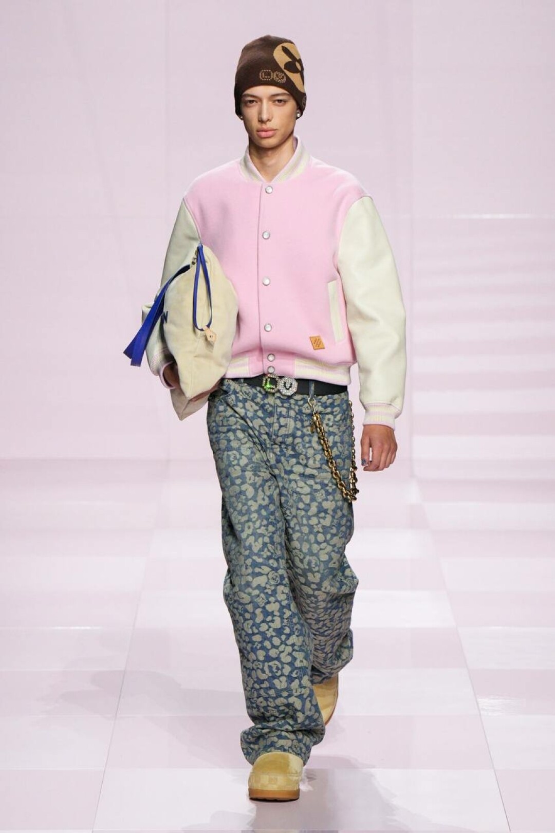 Не спешим списывать со счетов нулевые — у Фаррелла (при поддержке Ниго из Kenzo) на эту фэшн-эпоху большие планы. Вместо гламура с заниженными скинни, узенькими рубашками и тонкими шарфиками имени Эштона Кутчера (а теперь и Тимоти Шаламе!) — гипер-бермуды из денима, скейтерские шузы, original бомберы (как те самые, что носили школьники-футболисты в американских ромкомах), велюровые костюмы и даже про раскладушки и массивные цепи на ремнях не забыли. Хотя полностью от гламура дизайн-дуэт решил все-таки не отказываться: за него отвечали розовая Speedy (в пору чихуахуа Пэрис Хилтон!), bubble gum двойка и сверкающий кристаллами кардиган в шашечку damier, Барби-сундуки, которые вывозили под аккомпанемент оркестра. Однако все это — от воссоздания моды 2000-х до фирменных сундуков и даже оркестра — цитирование самого себя версии SS'25.