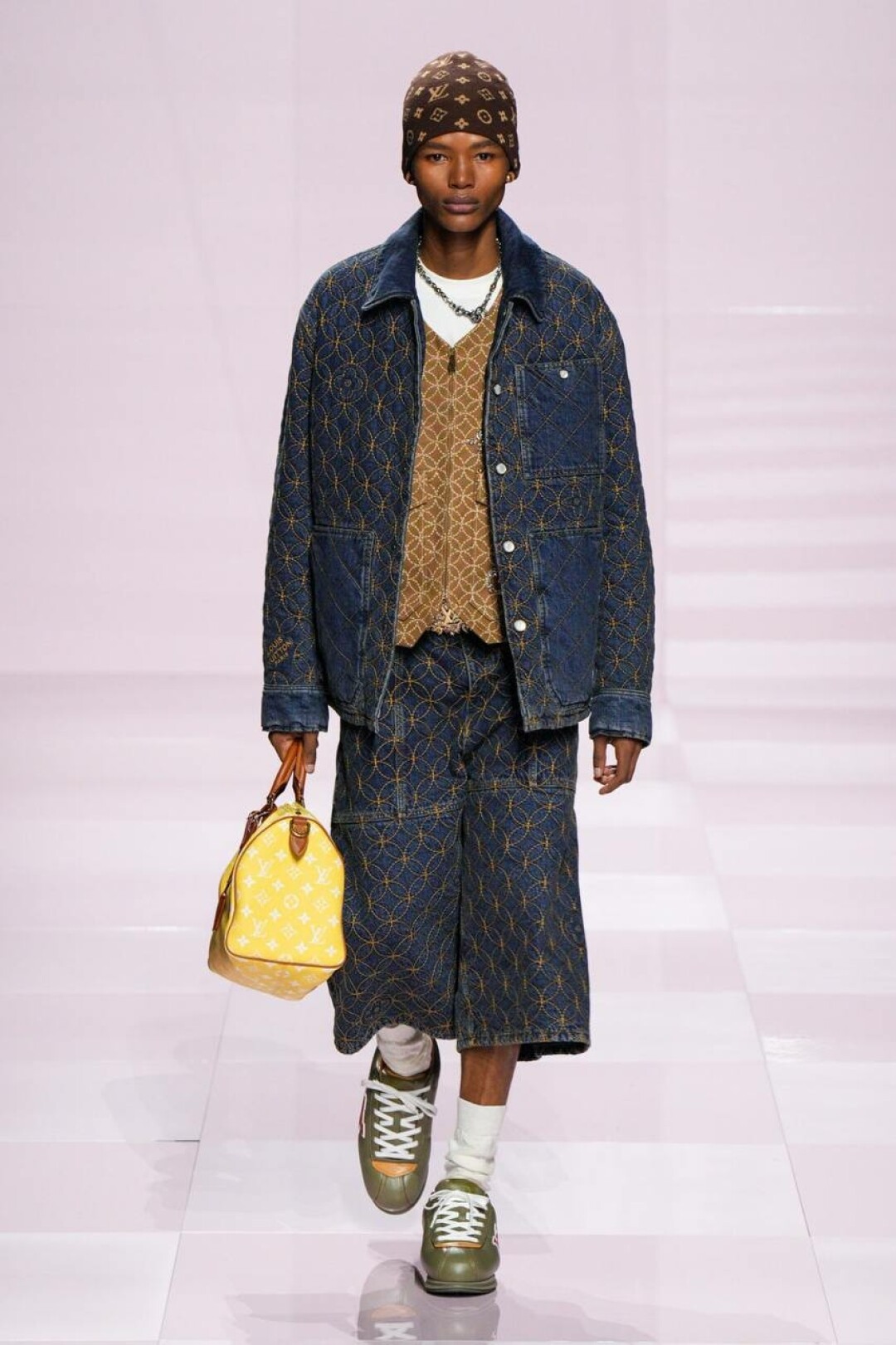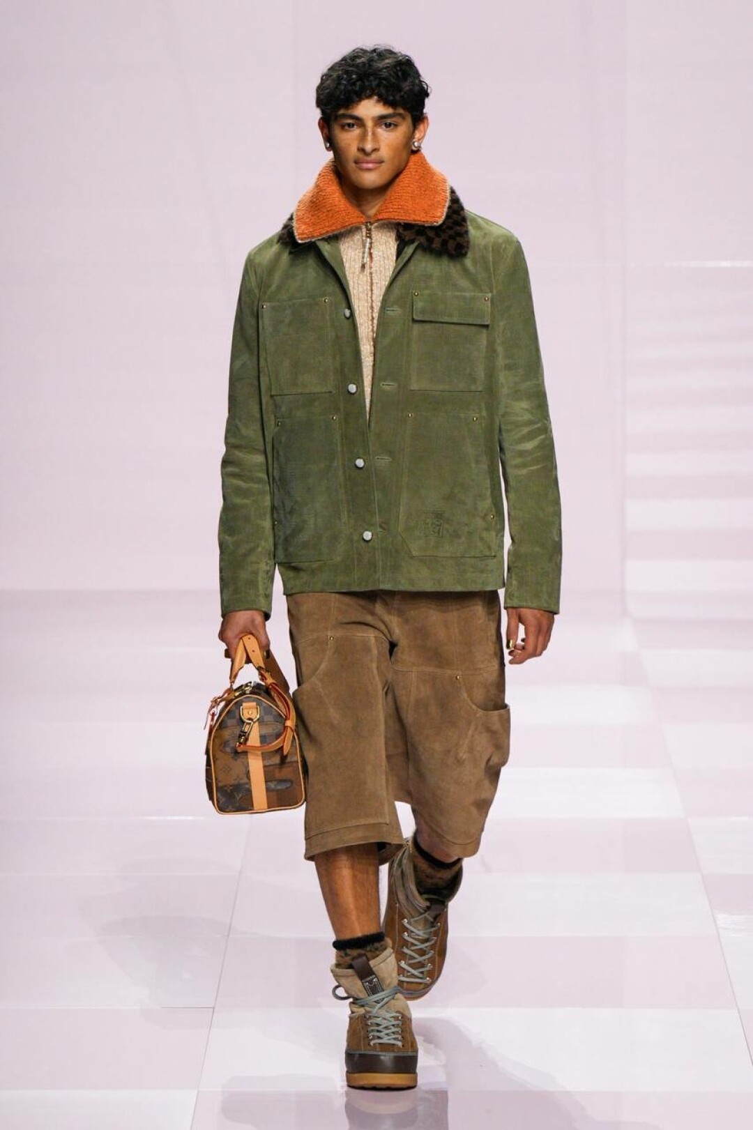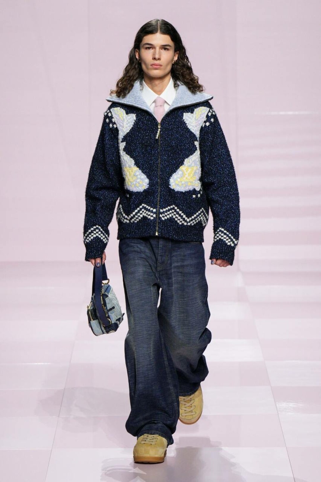 Не спешим списывать со счетов нулевые — у Фаррелла (при поддержке Ниго из Kenzo) на эту фэшн-эпоху большие планы. Вместо гламура с заниженными скинни, узенькими рубашками и тонкими шарфиками имени Эштона Кутчера (а теперь и Тимоти Шаламе!) — гипер-бермуды из денима, скейтерские шузы, original бомберы (как те самые, что носили школьники-футболисты в американских ромкомах), велюровые костюмы и даже про раскладушки и массивные цепи на ремнях не забыли. Хотя полностью от гламура дизайн-дуэт решил все-таки не отказываться: за него отвечали розовая Speedy (в пору чихуахуа Пэрис Хилтон!), bubble gum двойка и сверкающий кристаллами кардиган в шашечку damier, Барби-сундуки, которые вывозили под аккомпанемент оркестра. Однако все это — от воссоздания моды 2000-х до фирменных сундуков и даже оркестра — цитирование самого себя версии SS'25.