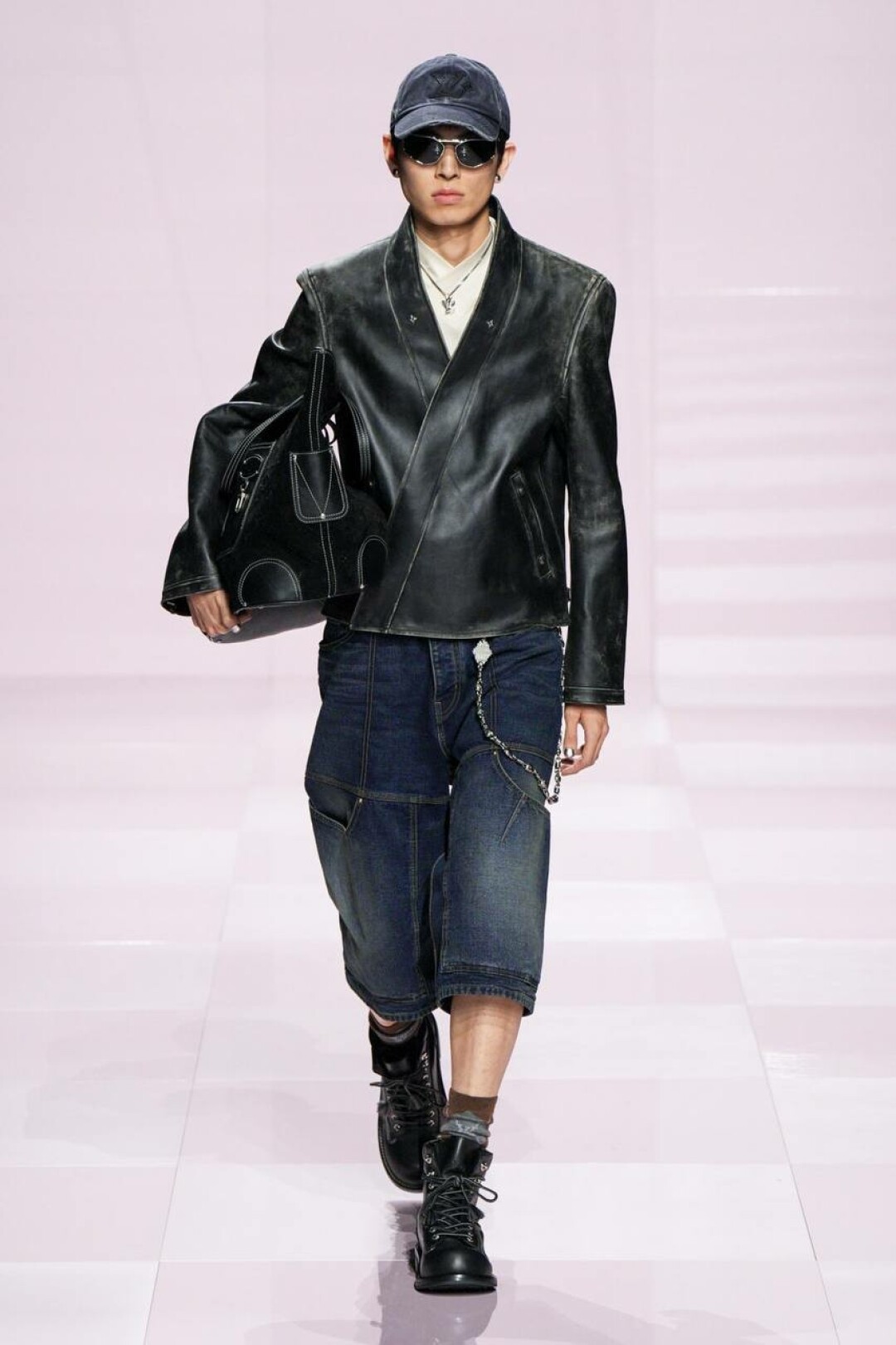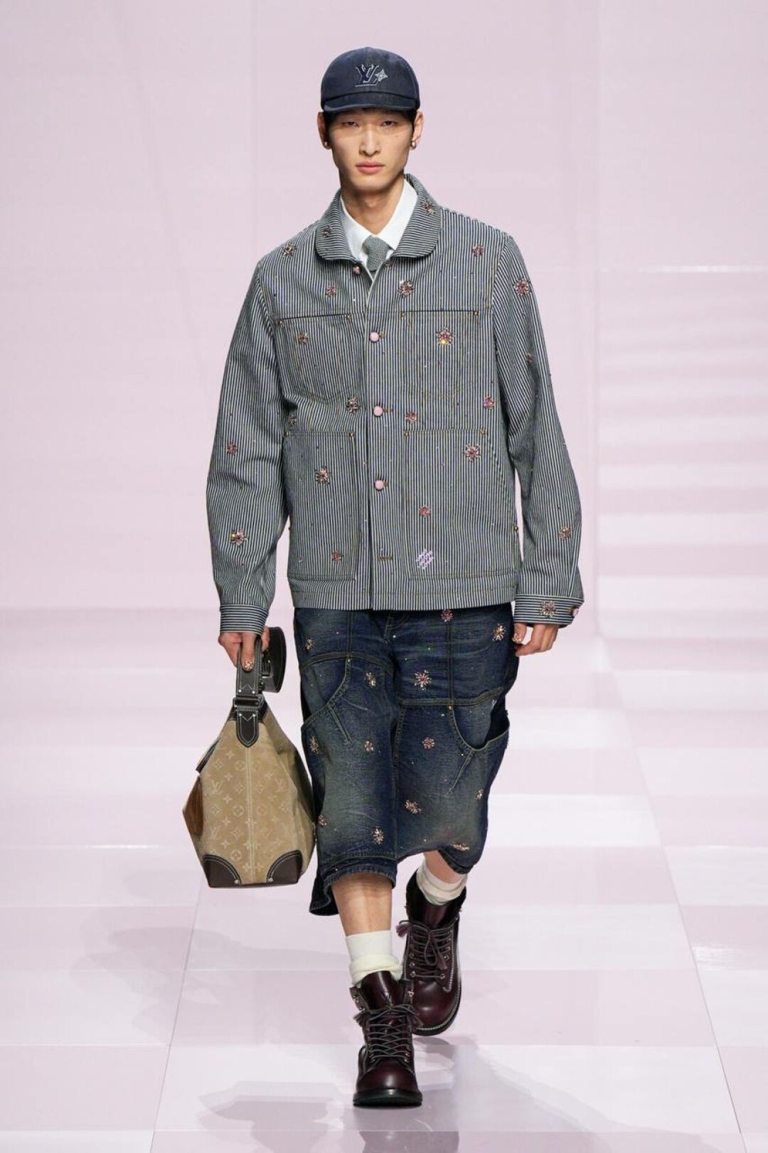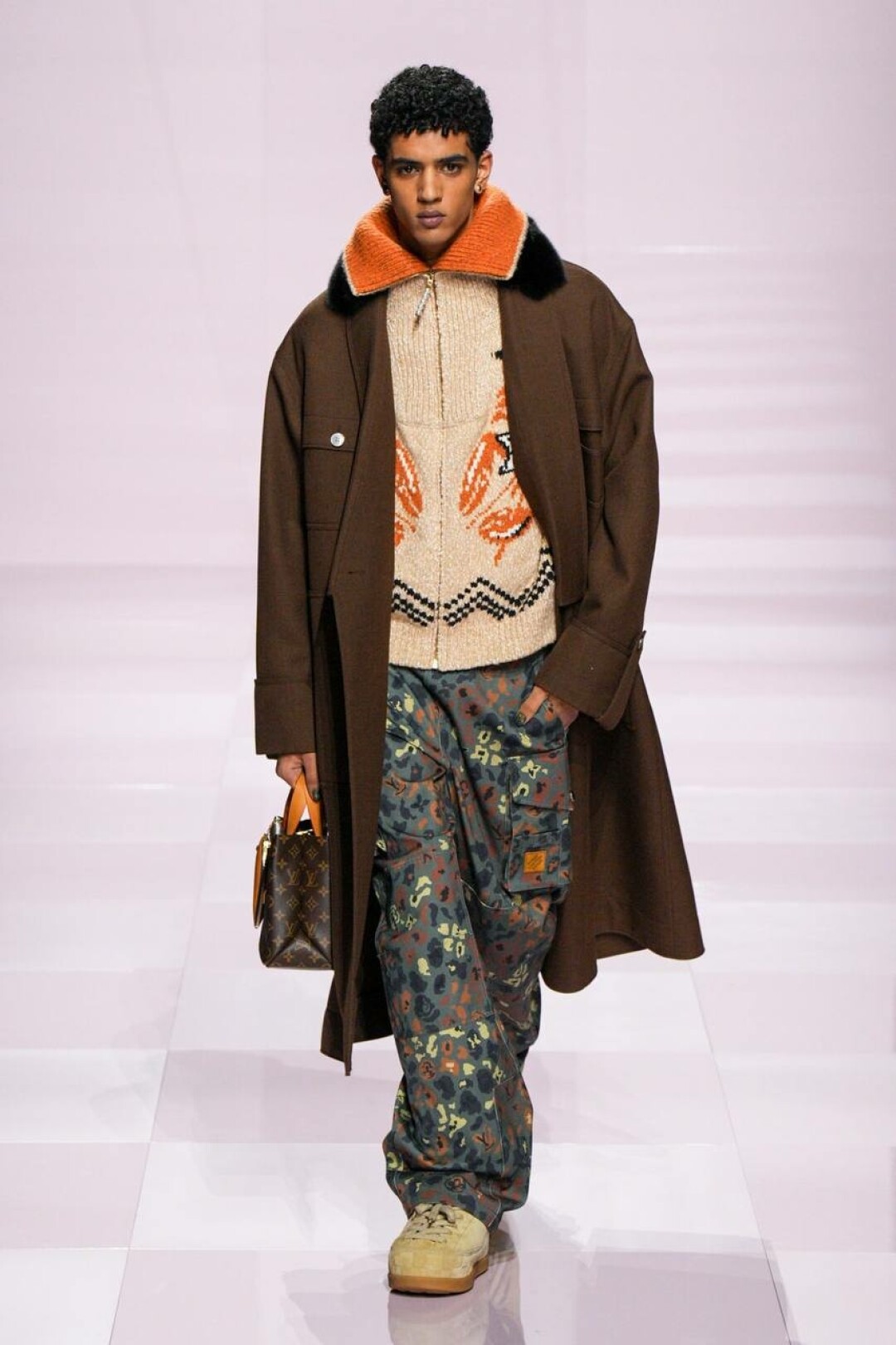 А остальное — очевидное влияние нанятого в помощь (явно, необходимую) креативного директора Kenzo — Ниго. Отсюда и кимонообразные кожанки, и ворот-мандарин на жакетах из денима, и карпы кои на кардиганах и в виде брелоков на ремне. Даже монограмма Louis Vuitton расплылась по мотокосухам, объемным карго и камуфляжным курткам и превратилась в причудливый и обожаемый Ниго флористический узор.