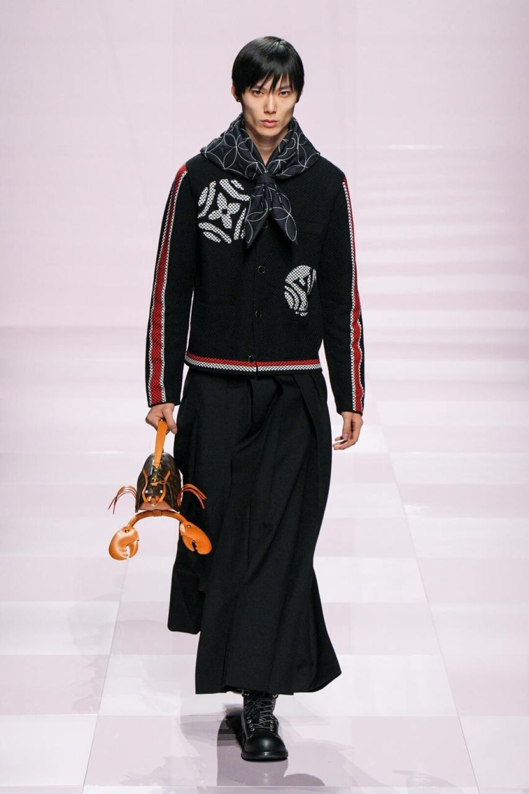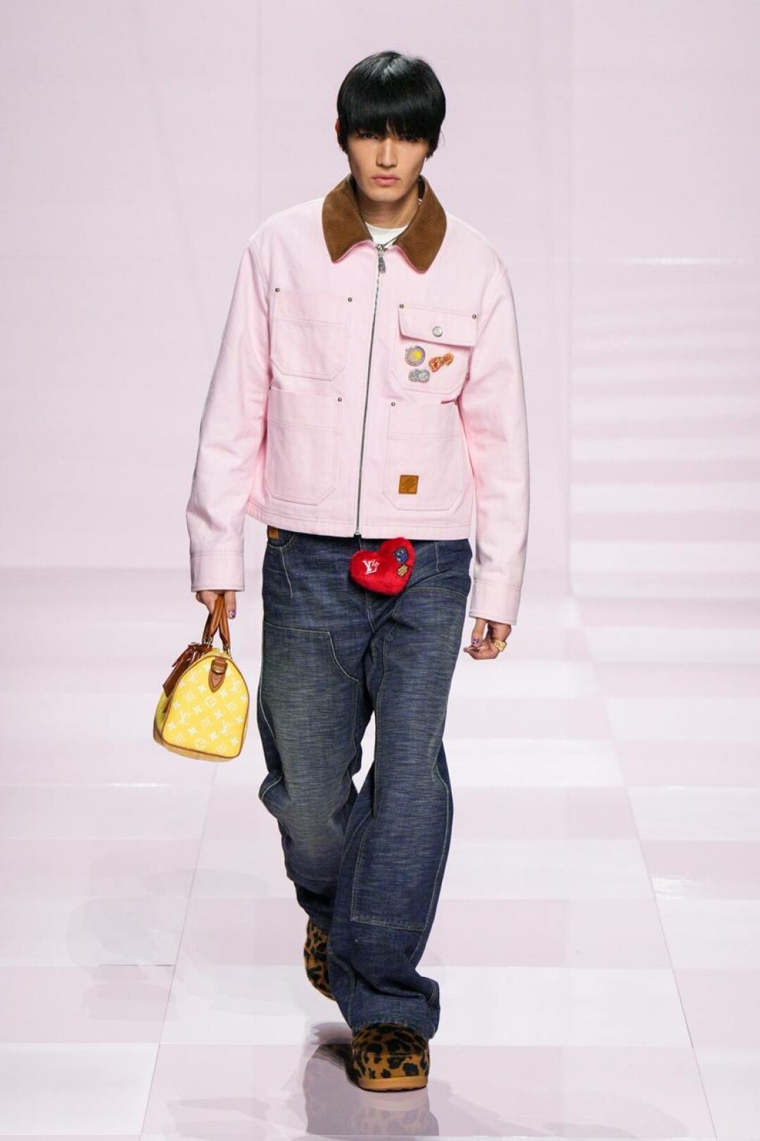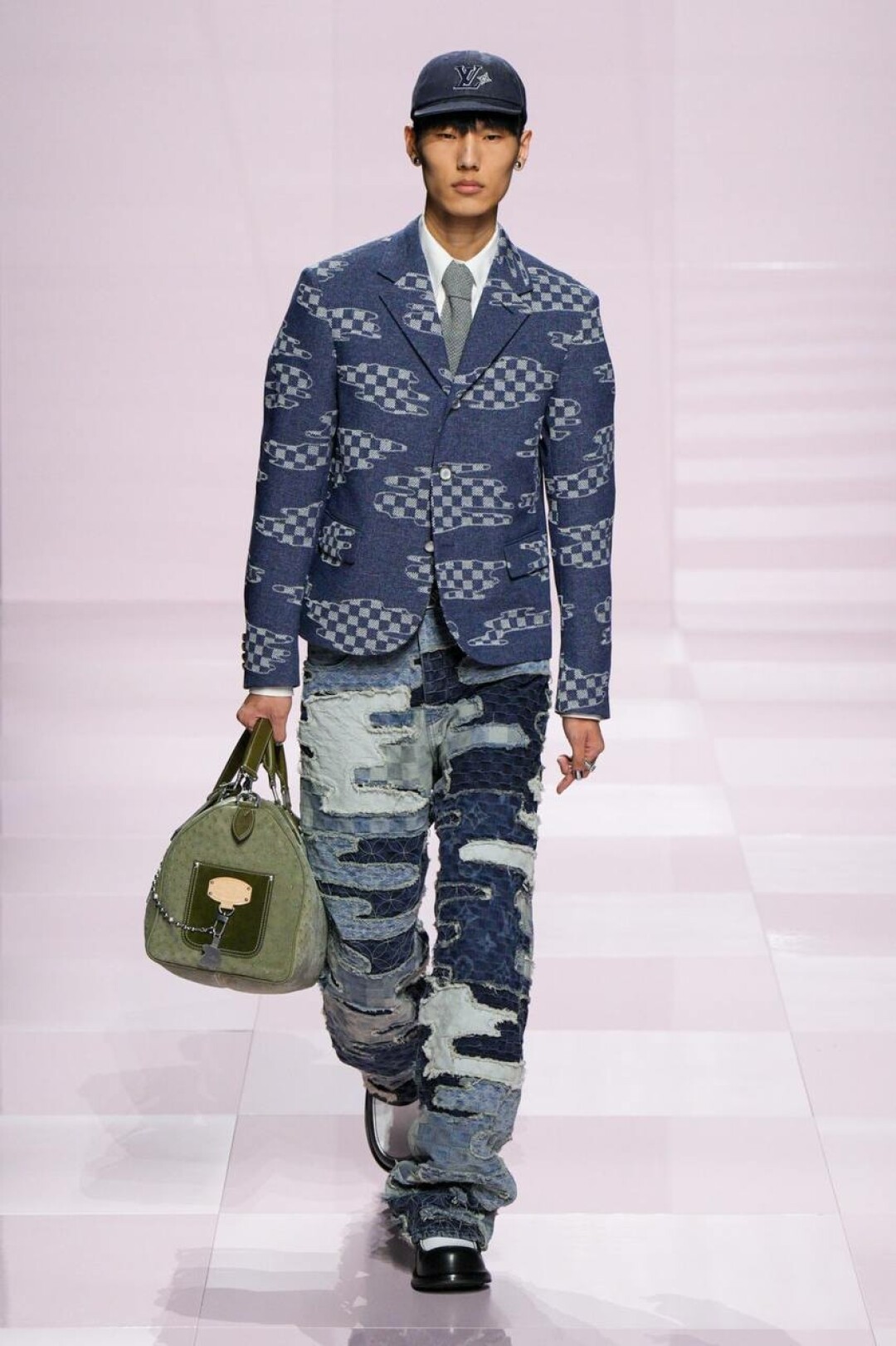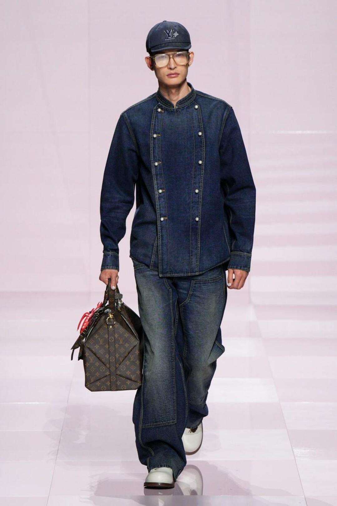 А остальное — очевидное влияние нанятого в помощь (явно, необходимую) креативного директора Kenzo — Ниго. Отсюда и кимонообразные кожанки, и ворот-мандарин на жакетах из денима, и карпы кои на кардиганах и в виде брелоков на ремне. Даже монограмма Louis Vuitton расплылась по мотокосухам, объемным карго и камуфляжным курткам и превратилась в причудливый и обожаемый Ниго флористический узор.