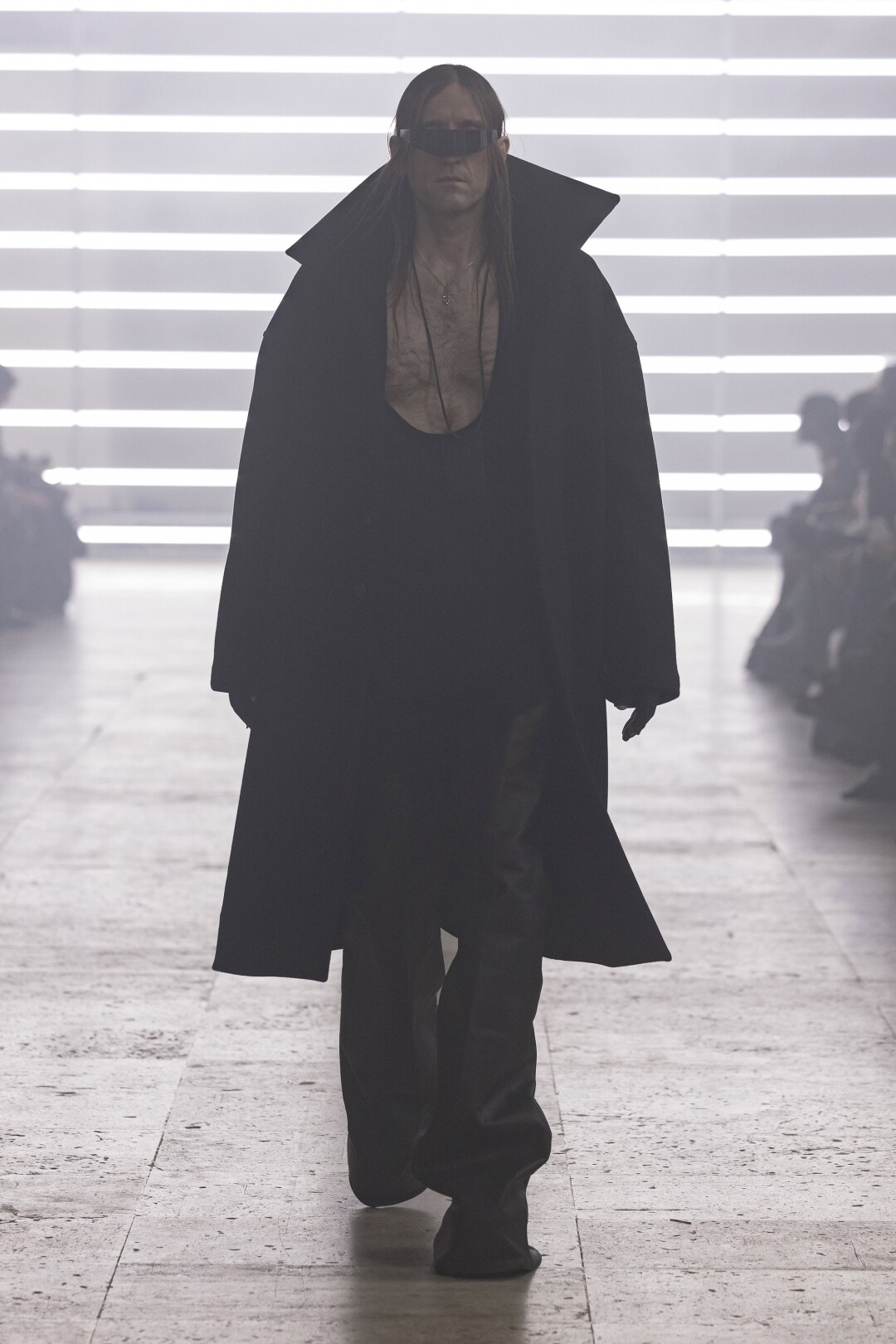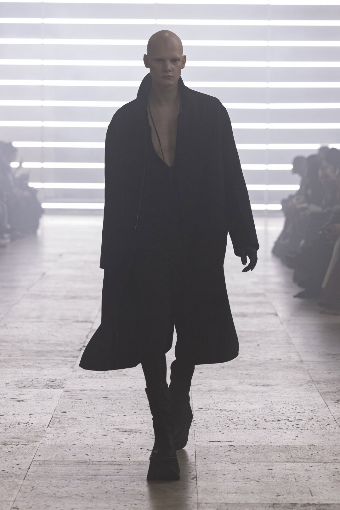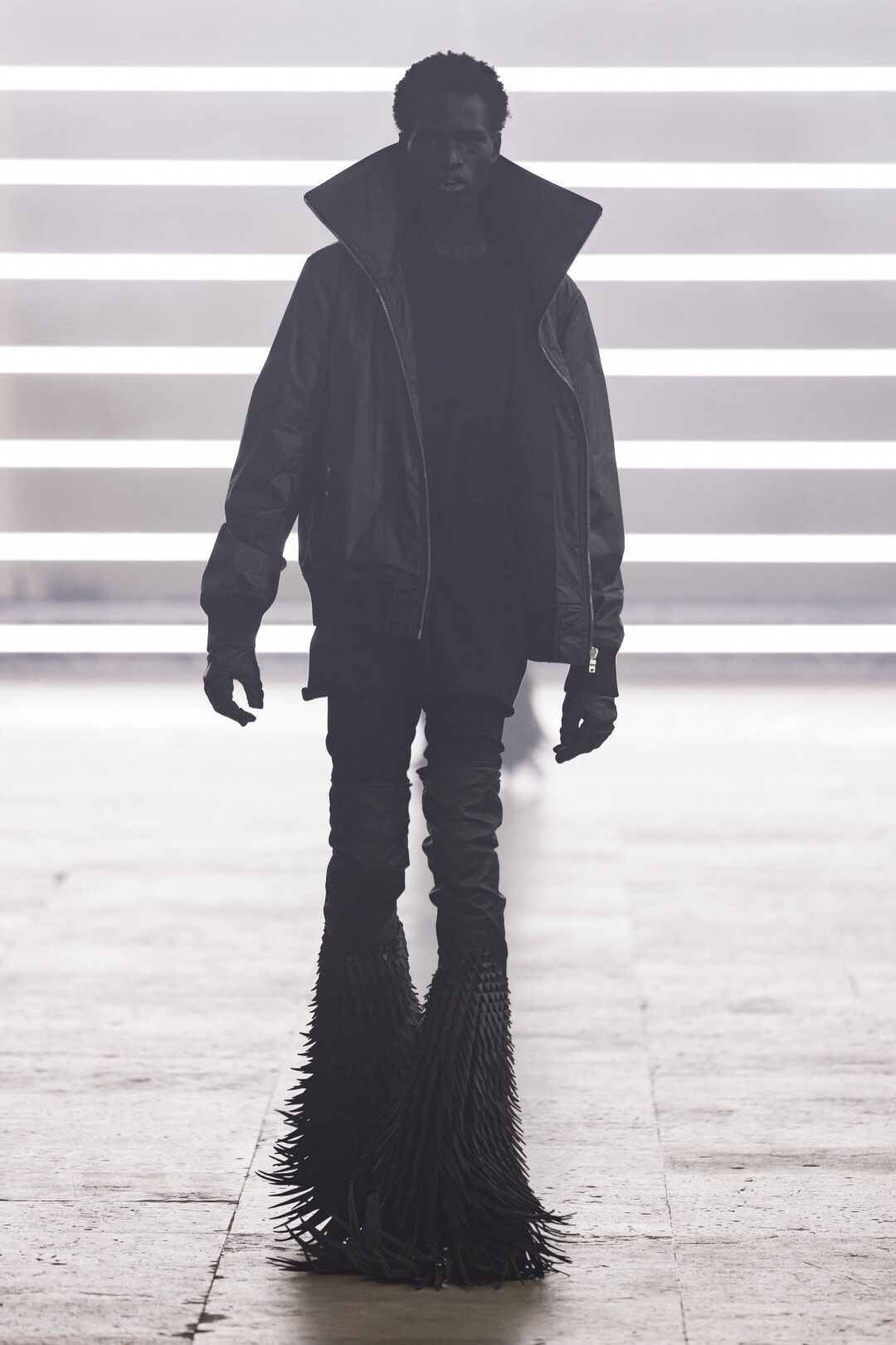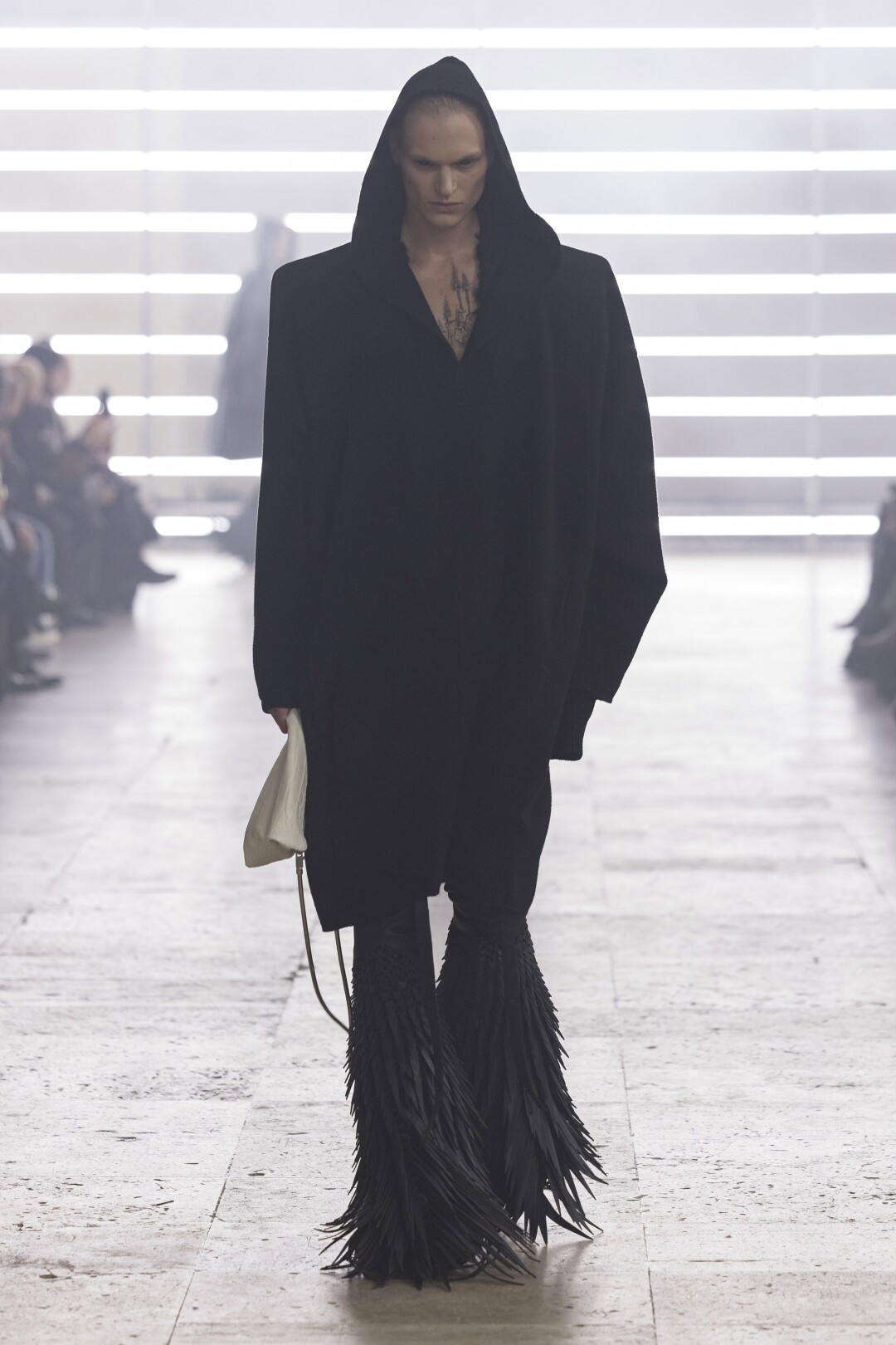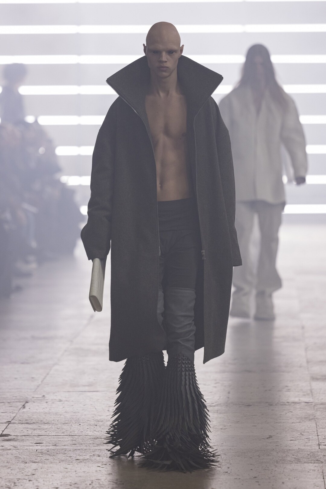 Главный мастхэв мужской коллекции Rick Owens FW'25 — инопланетные сапоги из чешуйчатой бахромы (уже представляем на Salavat Kypere и леших из рассказов Аллы Горбуновой!), созданные в коллаборации с дизайнером Виктором Клавелли: в них модели героически прошагали под полифоничный микс «Heroes» Дэвида Боуи.