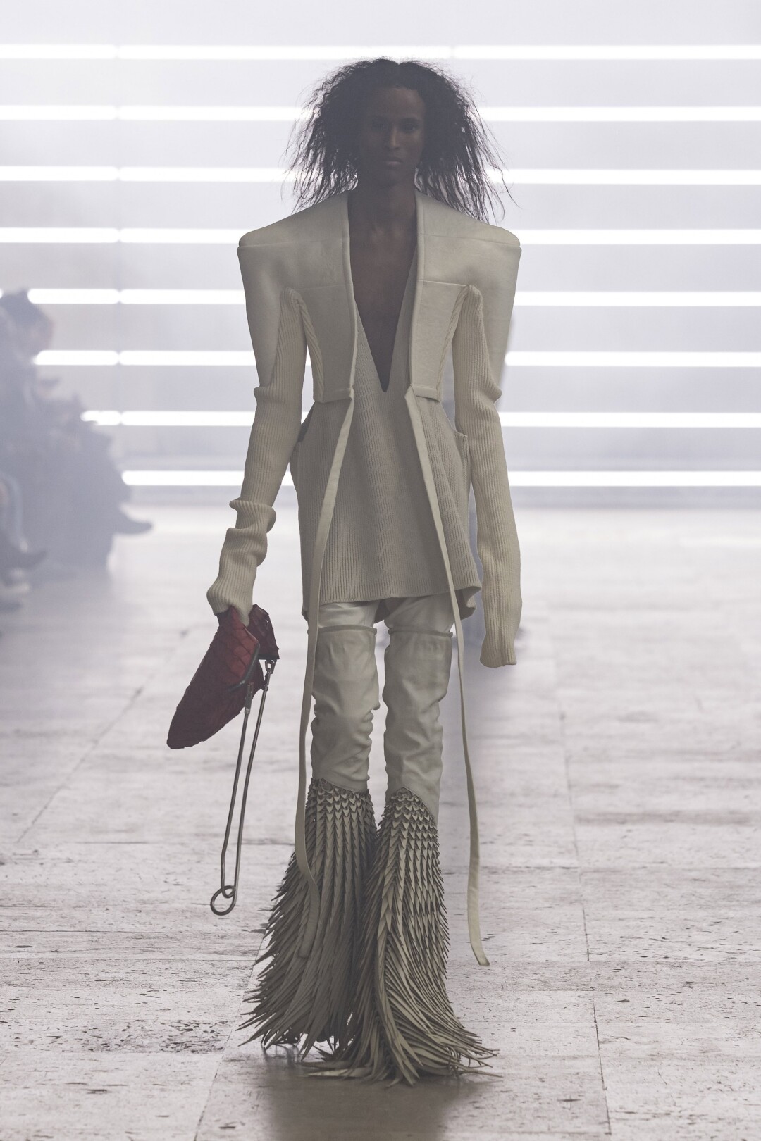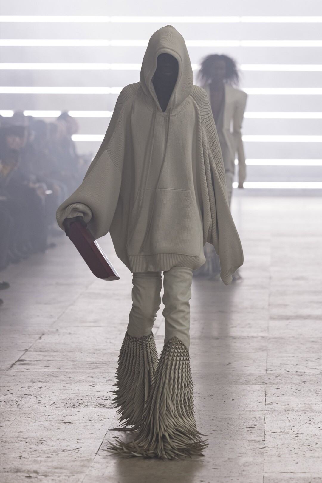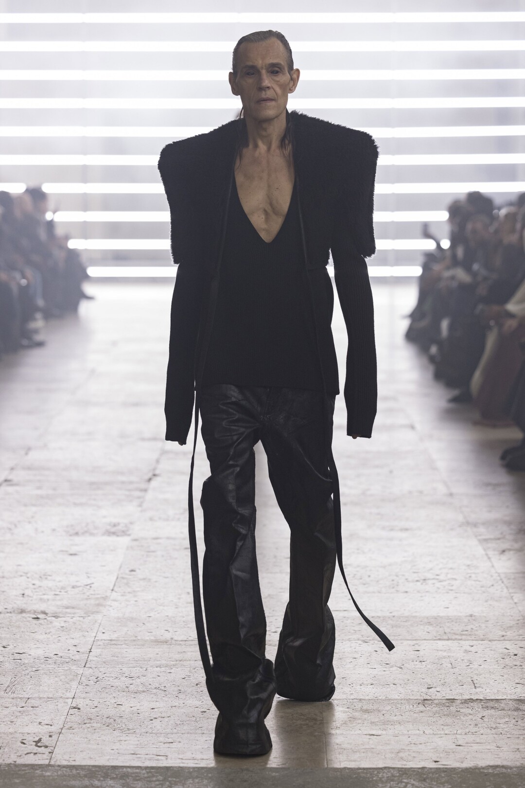 Фэшн-гид по макабрическому ворквиру: ожерелья из коровьего меха, каучуковые топы с толстовками (как и прежде, созданы в коллабе с гуру латекса Матисс ди Маджио!), а также брюки, рубашки и сумки, сшитые из выбеленной кожи аллигатора. Часть аскетичной готики на шоу Рик списал с самого себя: например, кроп-свитера из овечьей шерсти (поддерживаем тренд на укороченно-приталенные силуэты!) и теплые кальсоны, которые дизайнер полюбил после переезда в Париж из Лос-Анджелеса в 2003 году. «Вначале зимы были трудными. Я не ношу нижнее белье, так что меня выручило термобелье».