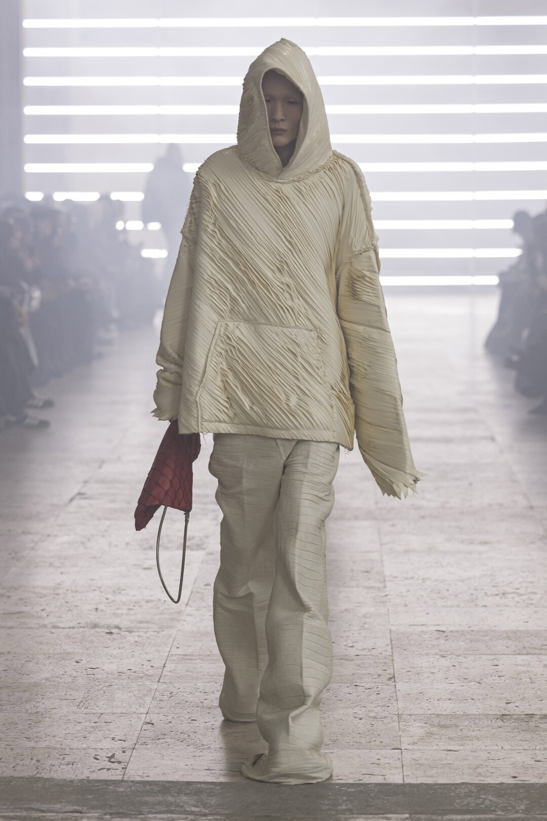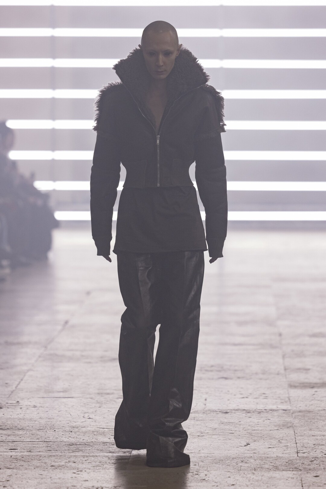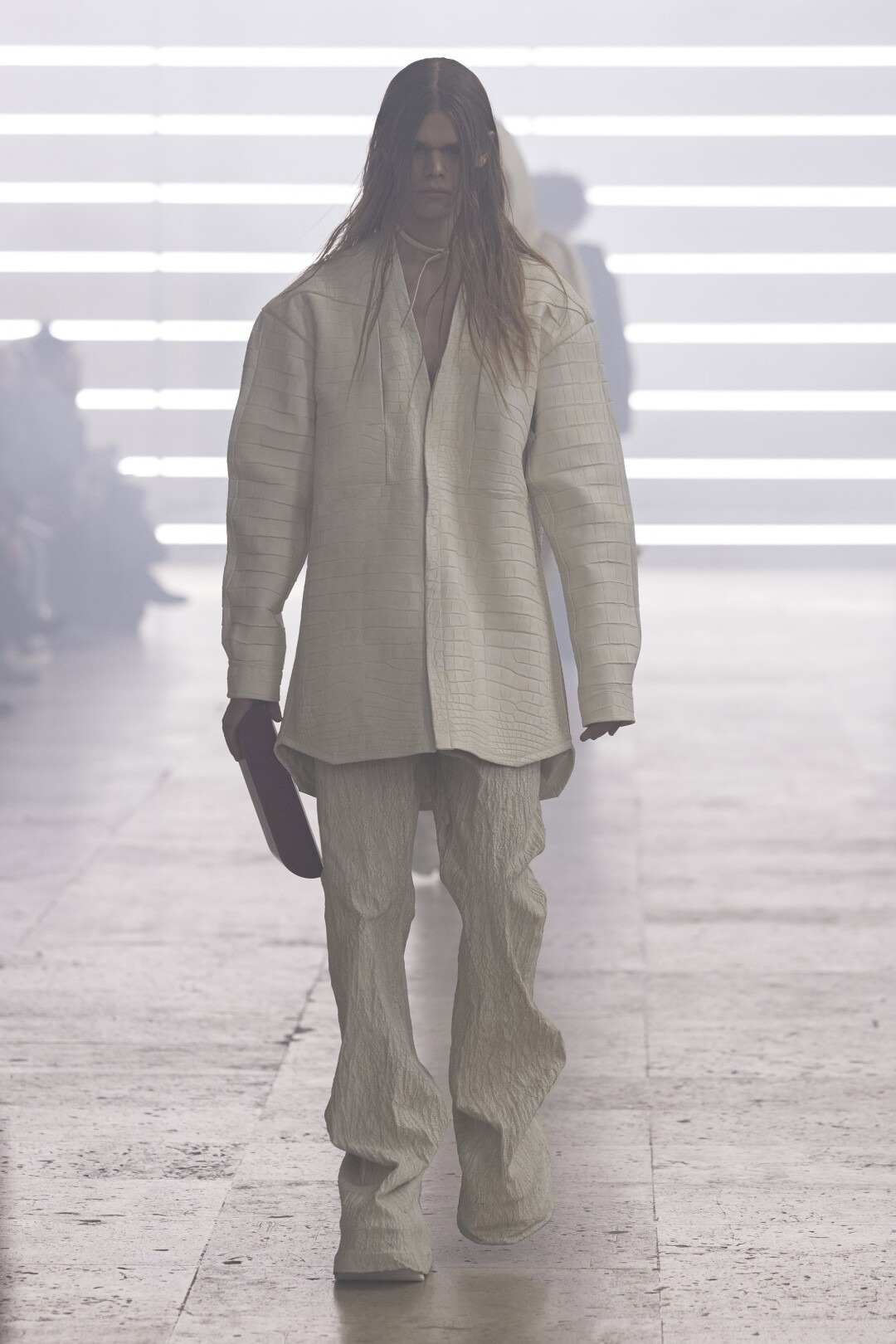 Фэшн-гид по макабрическому ворквиру: ожерелья из коровьего меха, каучуковые топы с толстовками (как и прежде, созданы в коллабе с гуру латекса Матисс ди Маджио!), а также брюки, рубашки и сумки, сшитые из выбеленной кожи аллигатора. Часть аскетичной готики на шоу Рик списал с самого себя: например, кроп-свитера из овечьей шерсти (поддерживаем тренд на укороченно-приталенные силуэты!) и теплые кальсоны, которые дизайнер полюбил после переезда в Париж из Лос-Анджелеса в 2003 году. «Вначале зимы были трудными. Я не ношу нижнее белье, так что меня выручило термобелье».