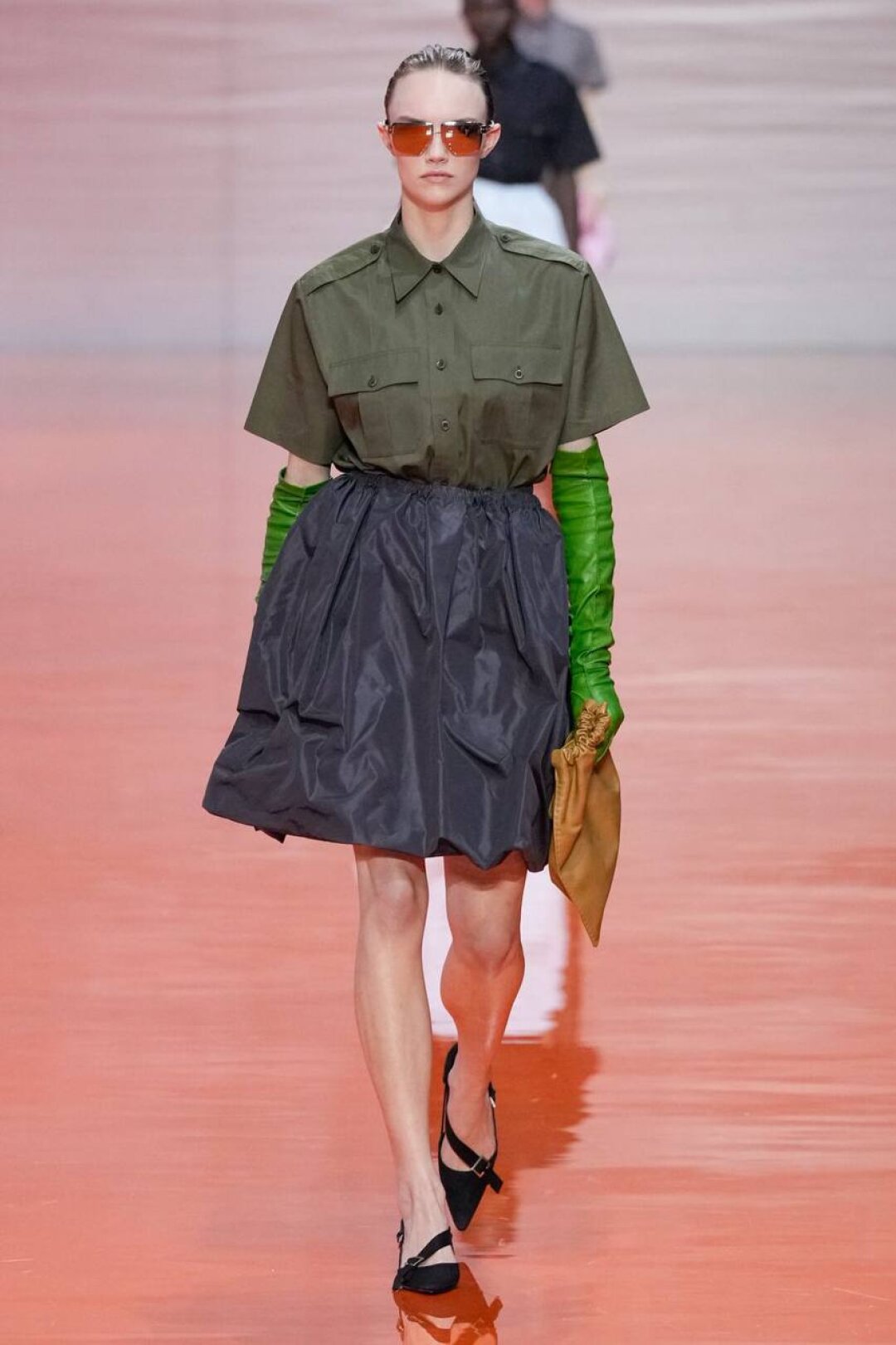 С одобрения худурков Prada продолжаем носить высокие перчатки: примеряем атласные в оттенке дыни или шафрановые из кожи. Отказываемся от привычных клатчей в пользу сумок-мешков, а обычные кроссовки меняем на серебристые спортшик-чешки. Плюс: говорим «да» нердовским оправам с прозрачными стеклами — носим с маскулинными оверсайз-рубашками, юбками-баллонами и лакированными слингбэками.