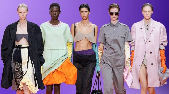 В этом сезоне Prada стала лучшей версией себя — моложе и явно веселее (влияние младшей сестры Miu Miu или порция субстанции?). Вместо угрюмых шерстяных платьев в духе голодающих 1940-х и тяжеловесных юбок из кожи и замши с показа FW’25 увидели кукольные жакеты на манер 60-х, инфантильные ромперы и псевдовинтажные блумерсы. А на замену мрачной палитре (вспоминаем черные массивные пальто, хвойные ретро-платья и свитеры цвете бургунди) пришли неон (в полном составе — от лайма до фуксии!) и пастель (от фисташкового до лимонного). Фиксируем главные сочетания (на зависть гуру цвета Сандзо Вада!): миксуем лазурный с баклажановым, в трио к травянистому подбираем персиковый и оливковый, сочный алый женим с лавандовым, а канареечно-желый — с нежно-розовым.