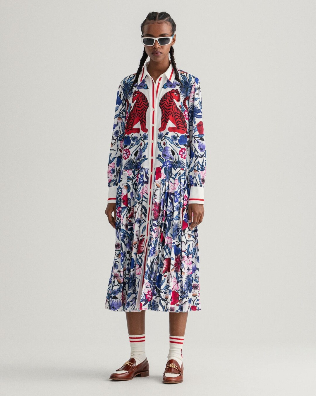 Какой праздник может обойтись без цветов? Уж точно не 8 марта. Предлагаем неординарный подход: вместо букета подарить платье с цветочным принтом. Обратите внимание на плиссированное платье-рубашку с экзотическими растениями и яркими тиграми. Платье по праву носит статус идеального: оно сочетается и с невесомыми босоножками, и ботинками-вездеходами, и кедами. Дико красиво!