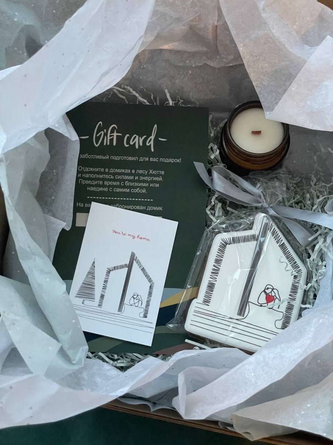 Подарочный бокс: сертификат в Хютте, пряник, свеча, открытка и готовая упаковка. От 5 000₽
