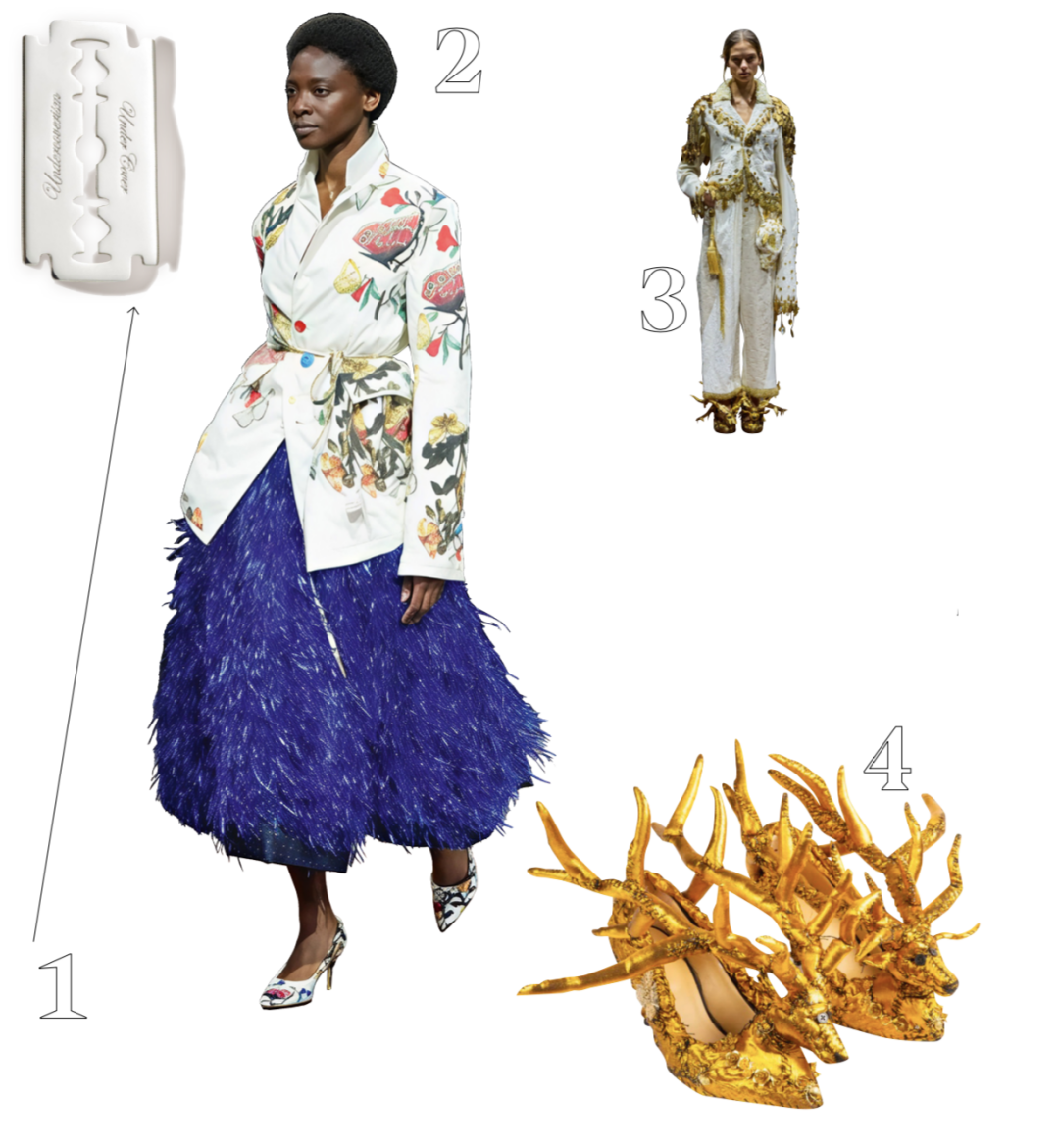 В новом сезоне в честь 35-летия бренда Джун перевыпустил собственные greatest hits из шоу But Beautiful 2004 года—от контркультурных курток в заклепках до шляп-федор с вайбом рок-иконы Патти Смит. «Когда я создавал те вещи, мне было 35. Теперь мне 55, и я хочу показать, как эти 20 лет отразились на моем дизайне». Маст-хэв Undercover этой осенью — асимметричный жакет { 2 } (на подиуме примерила Леся Кафельникова!), украшенный сверкающими бижу-перышками, которые уже видим в дуэте с панк-ботинками в шипах. Ну а белоснежные блейзеры с принтованными икебанами (в набоковских бабочках!) будем дополнять гранжевыми брошами-лезвиями { 1 } (даешь хардкор!).