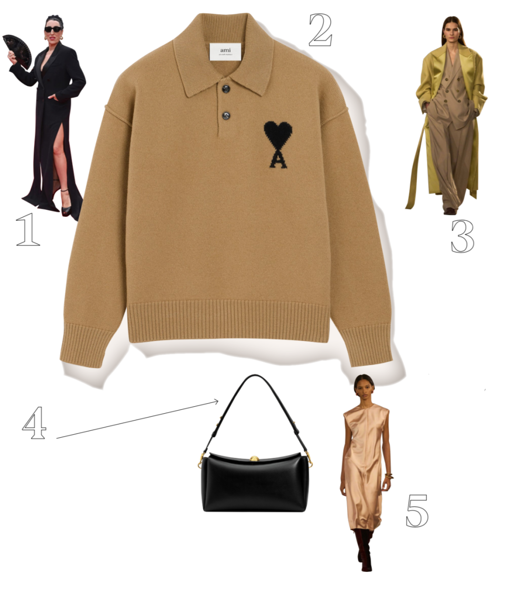 Мы знаем ученика Эди Слимана и мастера кэжуал-ромкора Алессандро Матиусси по фирменным лого-свитерам Ami Paris (хре- стоматийный маст-хэв тикток-парижанок!), но на деле бренд — хедлайнер вишлистов заядлых синефилов и критиков (на зависть любимцам киноиндустрии Loewe и Saint Laurent!). Одной рукой Ami Paris бодро букирует для кампейнов Сару Полсон, Лу Дуайон и Венсана Касселя, другой—спонсирует Международную неделю критики (ключевая секция Каннского кинофестиваля!) и собирает на красные дорожки кинодив Диану Крюгер, Джейн Фонду и Росси де Пальма { 1 } . Так что на осеннюю премьеру «Семейного счастья» сверхновой звезды режиссуры Стаси Толстой (любимица Алексея Учителя!) идем в топовых Ami-хитах: нерд-джемпере { 2 } в оттенке mocha mousse (цвет 2025 года по версии Института Pantone!) в комбо с костюмной двойкой { 3 } или струящимся платьем { 5 }, прихватив акцентный it-багет { 4 } со сферической застежкой и шелковый арт-платок (для катарсических слез!).
