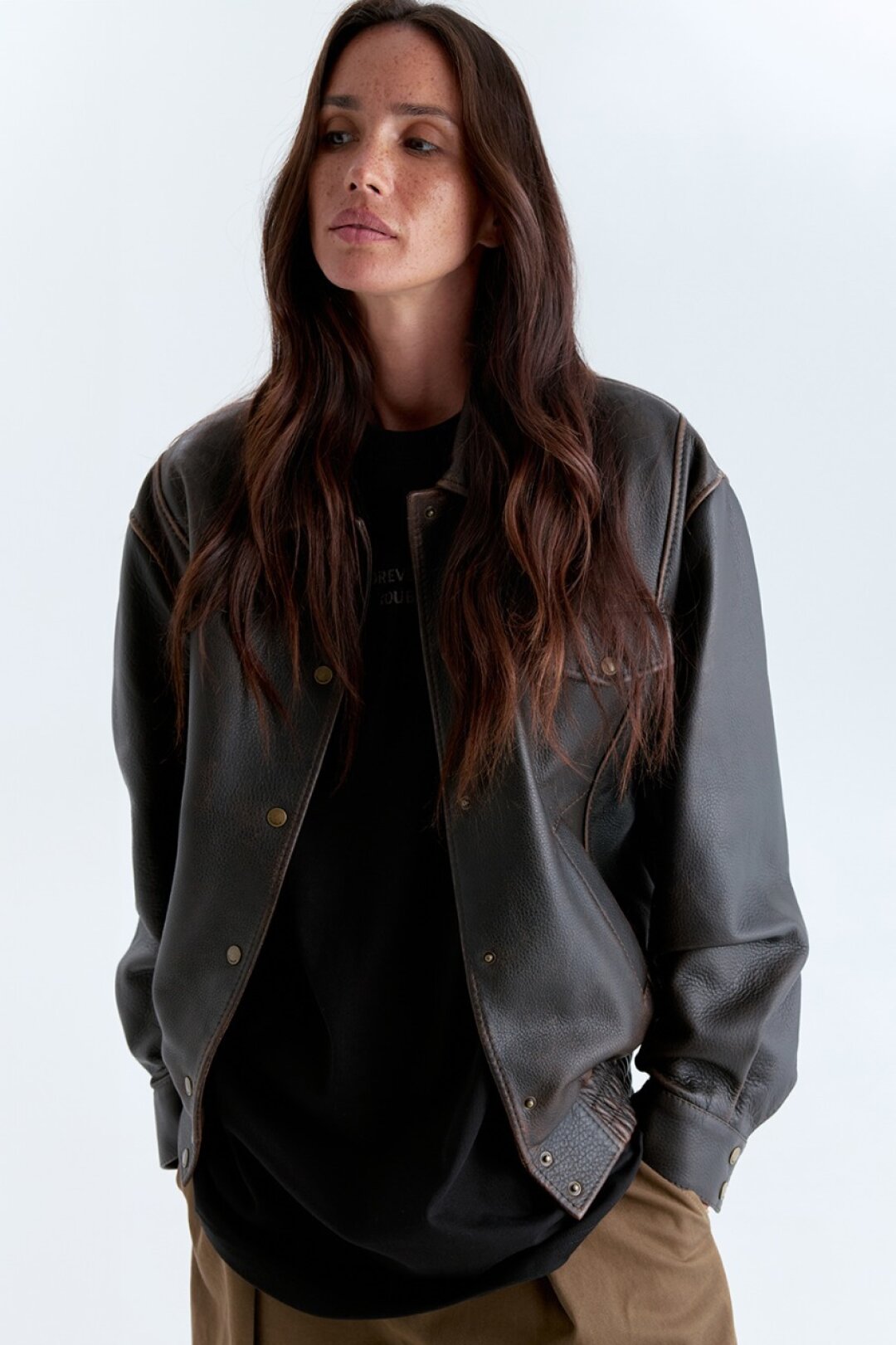 Их главный конкурент — бомбер с винтажным эффектом. С одобрения тихороскошной дивы Оксаны Рим и креативного директора нашего сердца Санана Гасанова (а еще — худрука Saint Laurent Энтони Ваккарелло!) примеряем кроп-кожанку Izeta, модель из потертой кожи Yuliawave и вишневый ретро-бомбер 12Storeez.