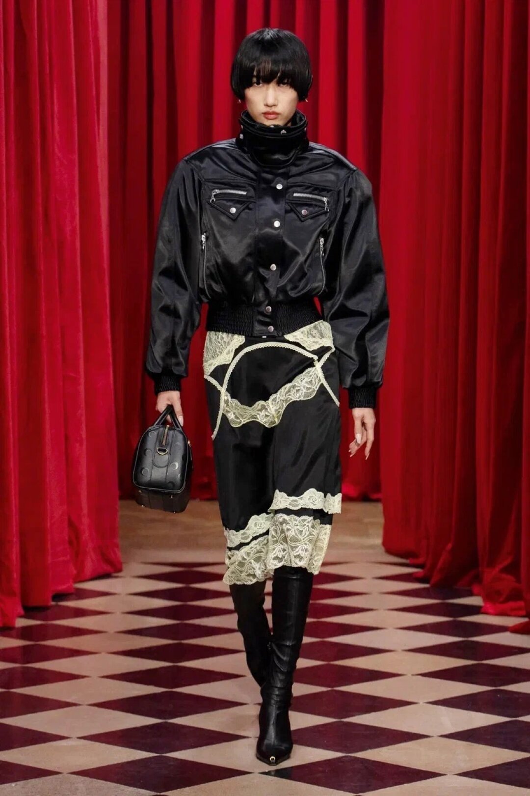 Вместе с худруком Saint Laurent Энтони Ваккарелло отрабатываем теорию «неправильной куртки» на практике — женим массивный кожаный бомбер с вечерней макси-юбкой с кринолином.