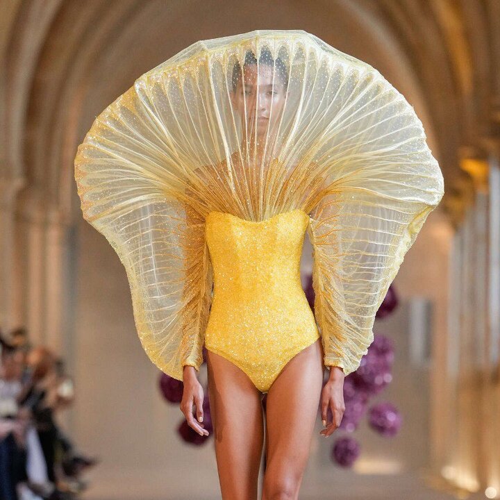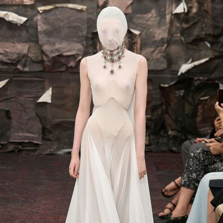 Худрук Ranevsky и настоящий фэшн-феномен (и лауреат конкурса Собака.ru «Новые имена в моде — 2025»!) Кирилл Раневский поженил виртуозный будуаркор с ар-деко 1920-х. Получились корсетные бодиконы с вшитыми панье, кружевные юбки с перьями и грандиозные макси с многослойными сетчатыми подолами.