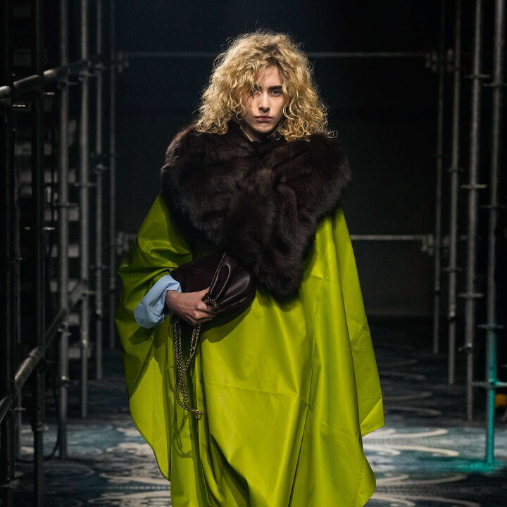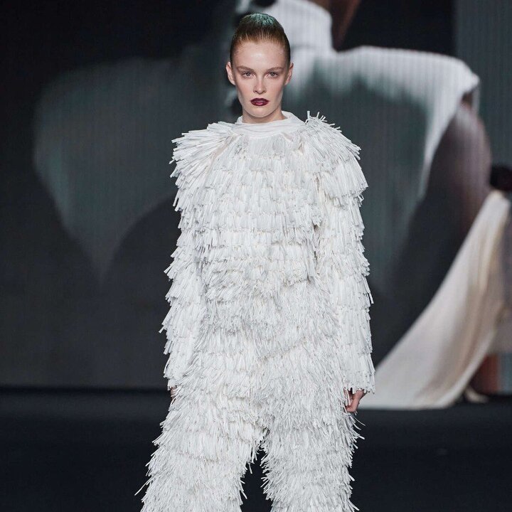Отправной точкой осенне-зимней коллекции Fabiana Filippi послужило творчество итальянского авангардиста Альберто Бурри — отсюда приглушенная, натуральная палитра и фактурные материалы: от ребристого трикотажа до шероховатой шерсти (Бурри писал по парусине, мешковине и обгоревшей древесине!). Главное стейтмент-комбо — мохнатый сет в оттенке горького шоколада с вязаными колготками-сеткой.