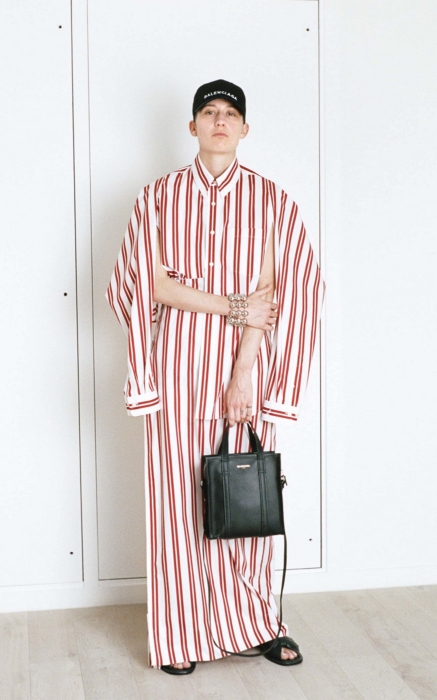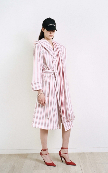 В круизной коллекции Демна Гвасалия демонстрирует традиционную иронию, адаптируя на люксовый лад коды парижских люмпенов: полосатые плащи имитируют банные халаты, шарфы с бахромой накинуты на одно плечо, как полотенце, а брендированные черные и белые бейсболки сочетаются с челночными сумками и аккуратными туфлями на шпильке. (ДЛТ)
