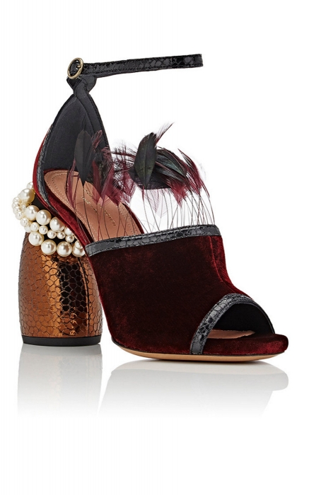 Словно выпавшие из костюма Одиллии драматичные перья, нитка жемчуга вокруг мозаичного каблука и бархат цвета бордо — туфли Dries Van Noten готовы к драматичному выходу напремьеру в БДТ: скоро выйдет новый спектакль Андрея Могучего «Губернатор». (бутик DayNight)