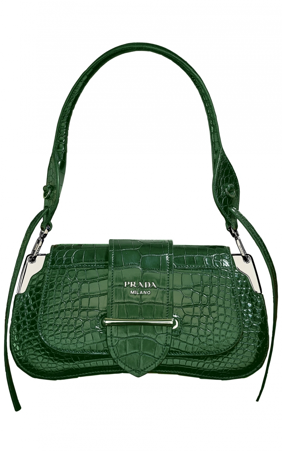 Миучча Прада придумала новую it-bag. У звезды круизного показа — сумки Prada Sidonie — пряжка и бирка позаимствованы из архивов дома начала ХХ века, но вписаны в совершенно новую, причудливо изогнутую форму. Мы за тяжелый люкс: выбираем экзотичную модель из ярко-зеленой крокодиловой кожи. (Prada)