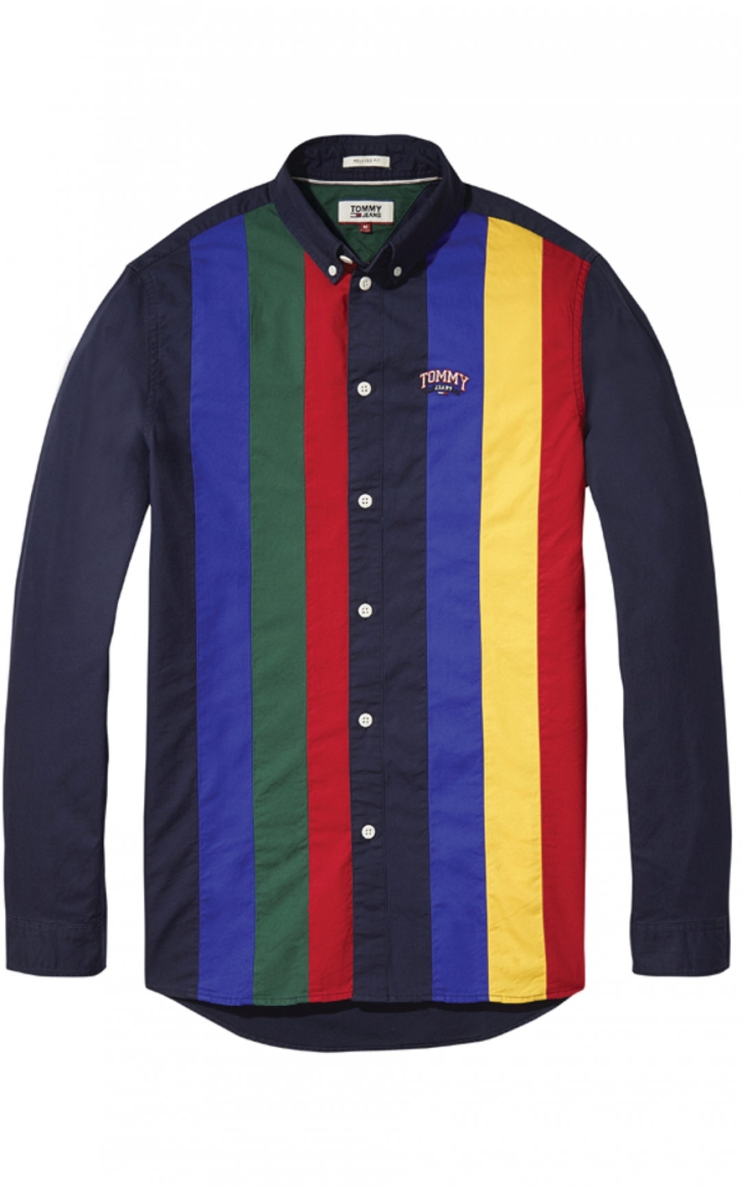 Рубашка Tommy Jeans косплеит винтажные костюмы игроков в бейсбол. Старомодная нашивка, чуть приглушенные тона разноцветных полос и трогательные пуговицы на воротничке — фанаты игр будут считать, что это настоящее американское ретро, а мы видим в ней живопись Казимира Малевича. (ТРЦ «Галерея»)