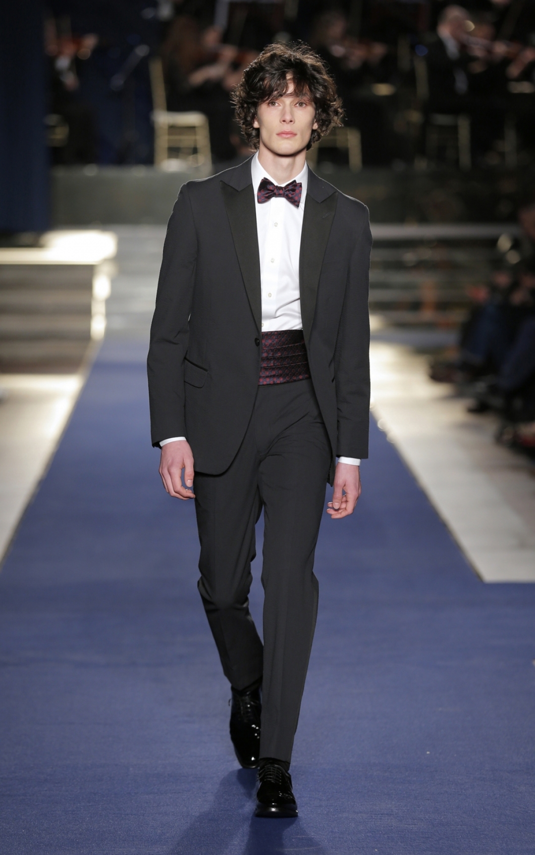 Мы подумали о вас и выбрали из коллекции Brooks Brothers, посвященной двухсотлетнему юбилею марки, самый новогодний аутфит. Костюм с лацканами только кажется классическим — по черным бабочке и поясу для смокинга рассыпан поп-артовый бордовый горошек. Именно так — с обязательными хулиганскими деталями — его бы и носил основатель бренда, денди Генри Сэндс Брукс. (Brooks Brothers)