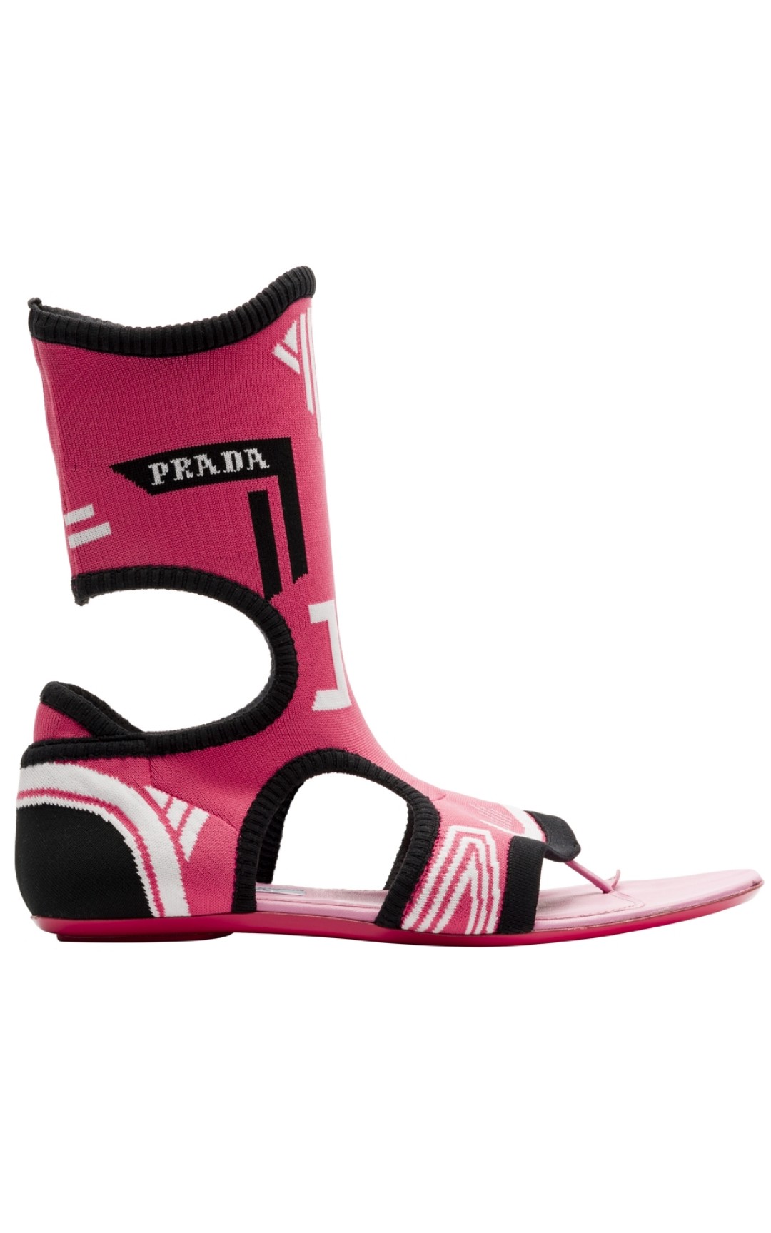 Что? Сандалии с носками? Да, если мастер-класс дает Миучча Прада. Эластичное комбо из того и другого с контрастным логотипом Prada и графикой в стилистике 1960-х — микс сезона. (Prada)