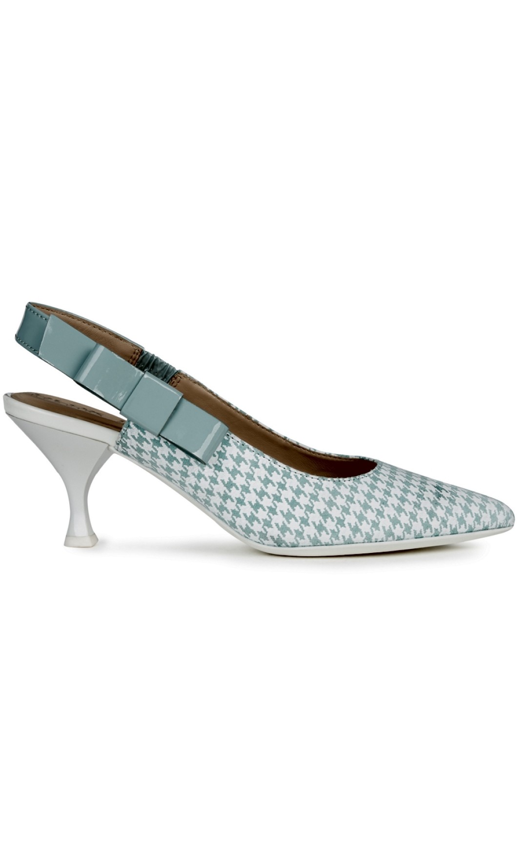 Тренд на 1960-е подхватили в фэшн-линии Geox: лодочки на каблуке-рюмке, именуемом kitten heel, украшены кокетливым лакированным бантом и узором в нежно-голубую «гусиную лапку». Мы хотим носить их с приталенными платьями, как героиня-фэшиониста из сериала «Удивительная миссис Мейзел». (geox.ru)