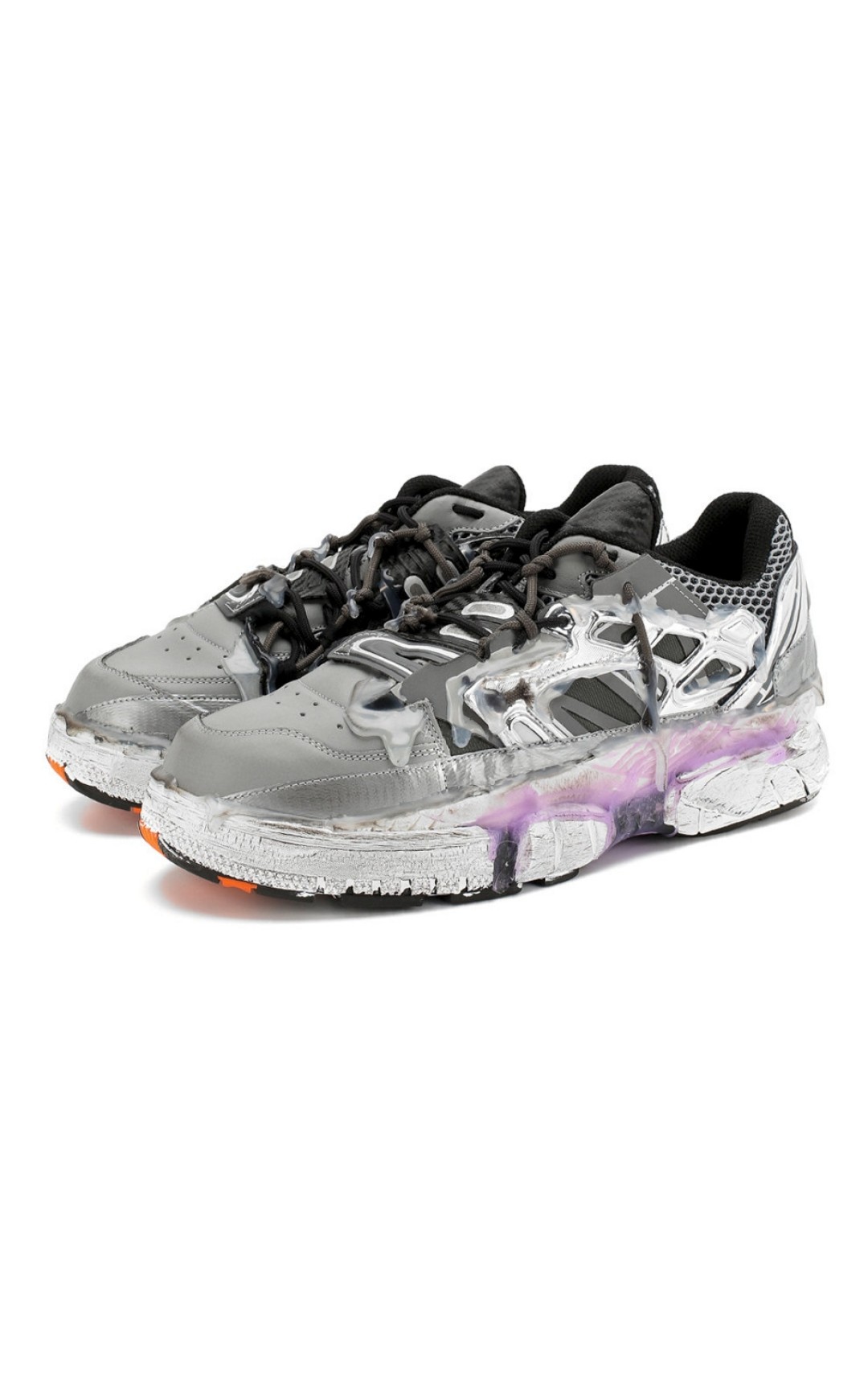 Креативный директор Maison Margiela Джон Гальяно продолжает исследование темы ugly shoes: кроссовки, будто бы испачканные подтеками клея, и асимметричная шнуровка с узлами — оммаж ночной жизни Лондона 1980-х и эстетике DIY — «сделай сам». (ДЛТ)