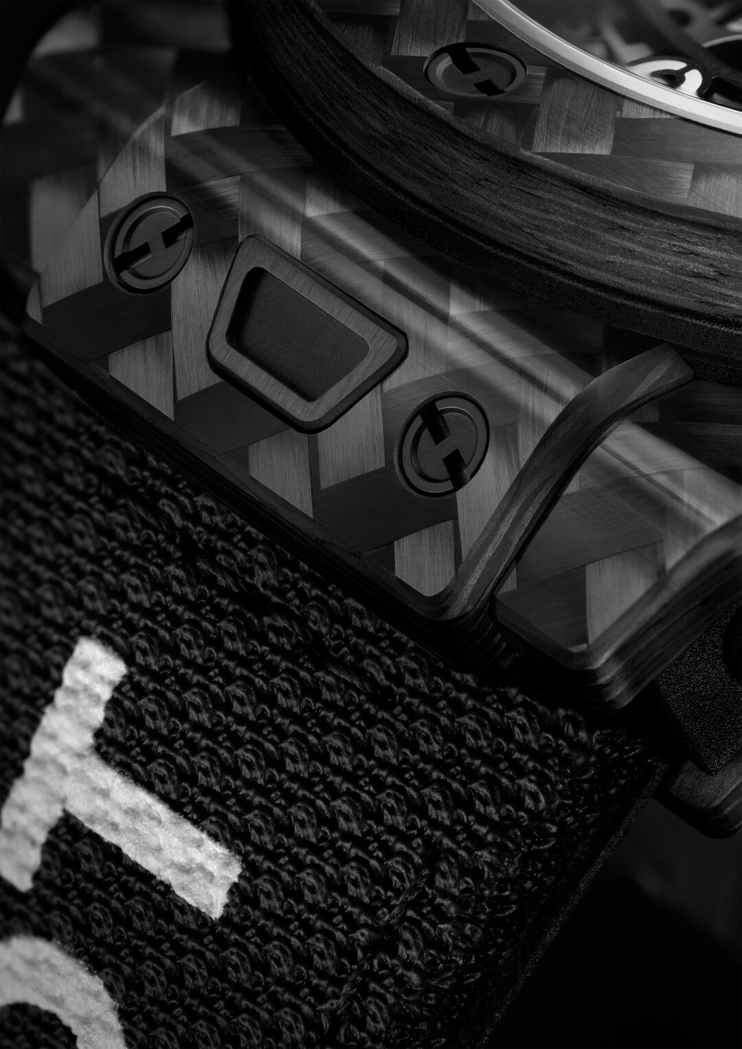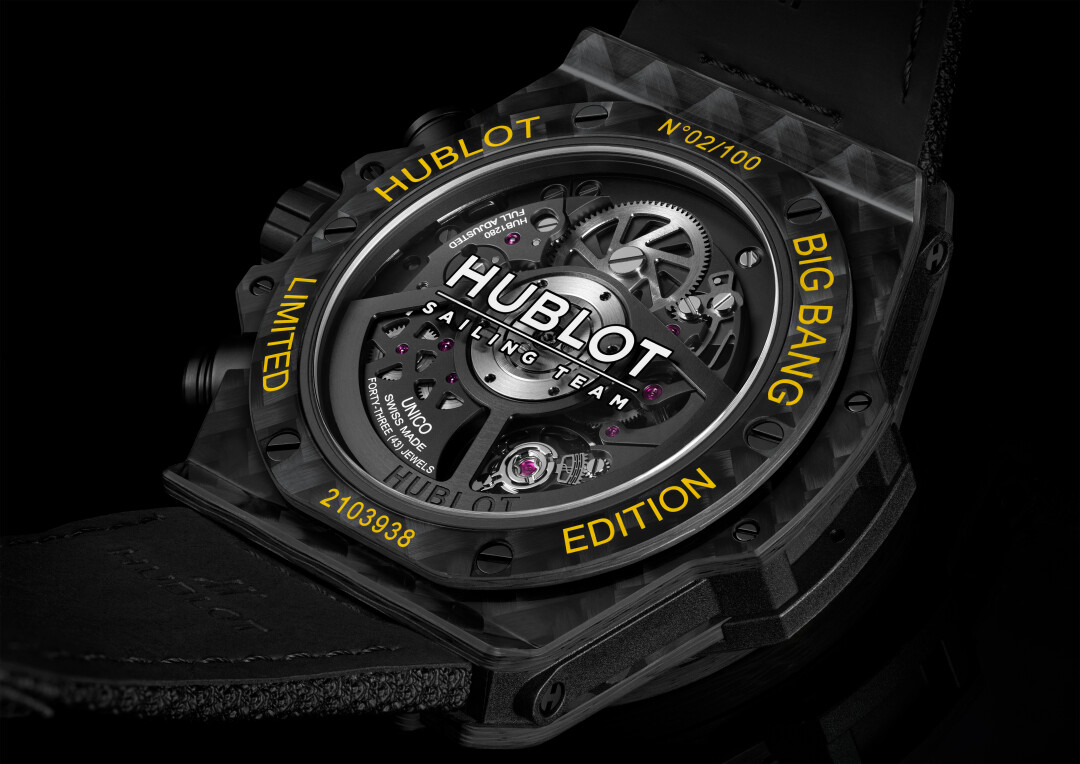 Черно-желтая палитра часов, зарифмованная с цветами яхты Руры, отсылает к дизайну первой модели Hublot Classic Original 1980-х годов (визитной карточке бренда). Для большей надежности мастера изготовили ремешок из легкого и крепкого полированного углеродного волокна со сверхпрочным полиуретановым покрытием, поверхность которого напоминает парусину. Кроме того, часы Big Bang Unico Sailing Team украшены надписью Hublot — точной копией той, что находится на гроте яхты Алана Руры. А для фиксации хронометра на запястье была специально разработана раскладывающаяся застежка из черной керамики.