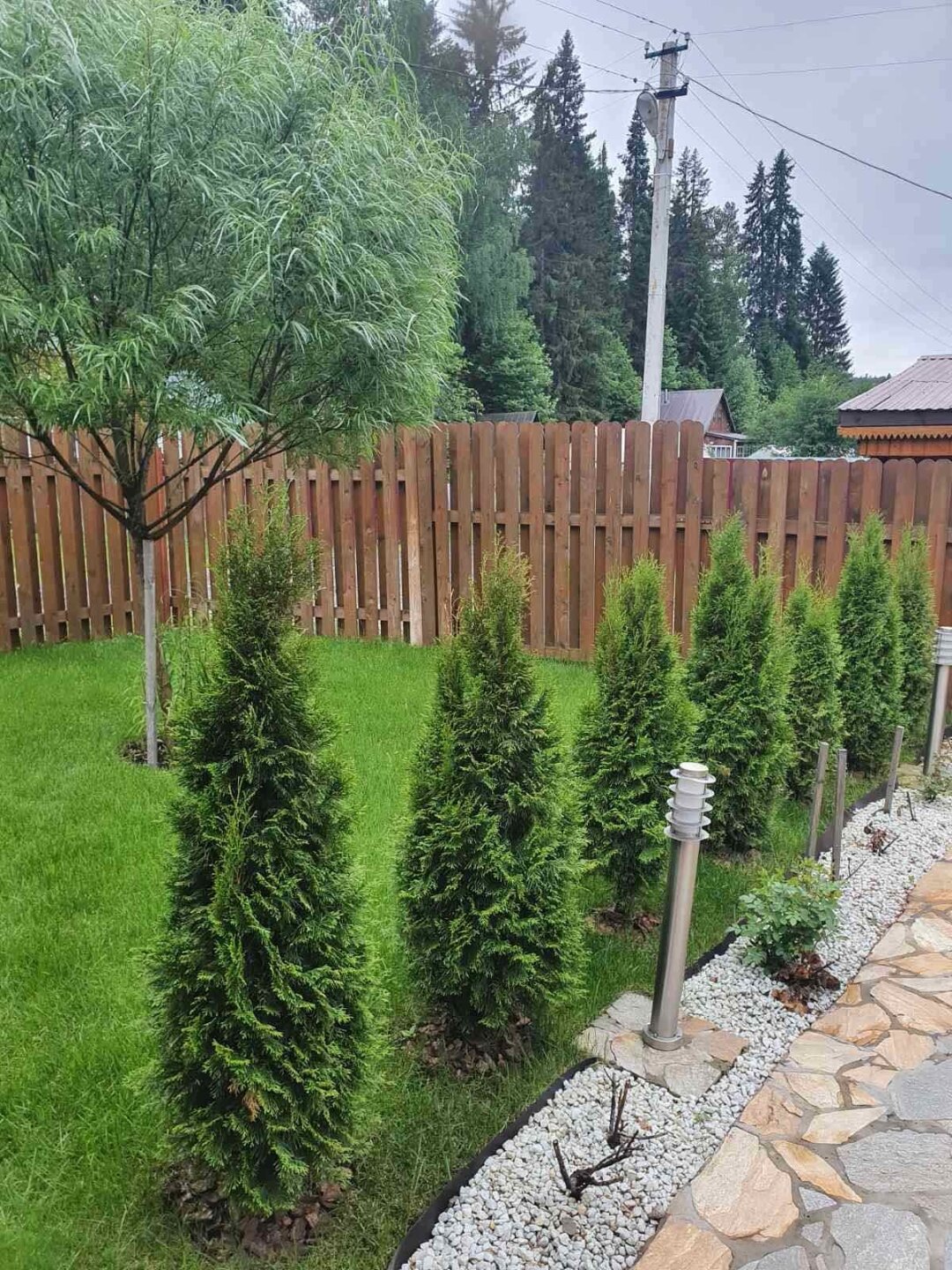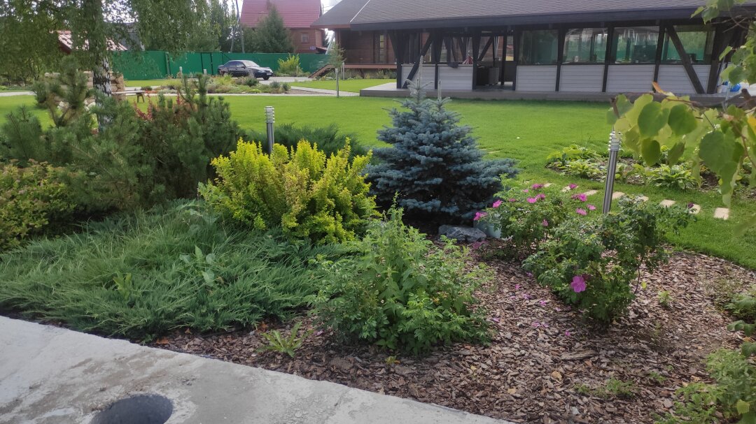 После того как дом построен, начинаем чистовые работы: заливаем бетон для дорожек и всех площадок. Последний этап — посадки, газон, озеленение и так далее. Здесь тоже много нюансов. Наша задача — так спланировать участок и озеленение, чтобы всегда было аккуратно, очень удобно, легко ухаживать, и весь сезон цветущие растения радовали глаз, а каждое дерево и кустарник были на своем месте.