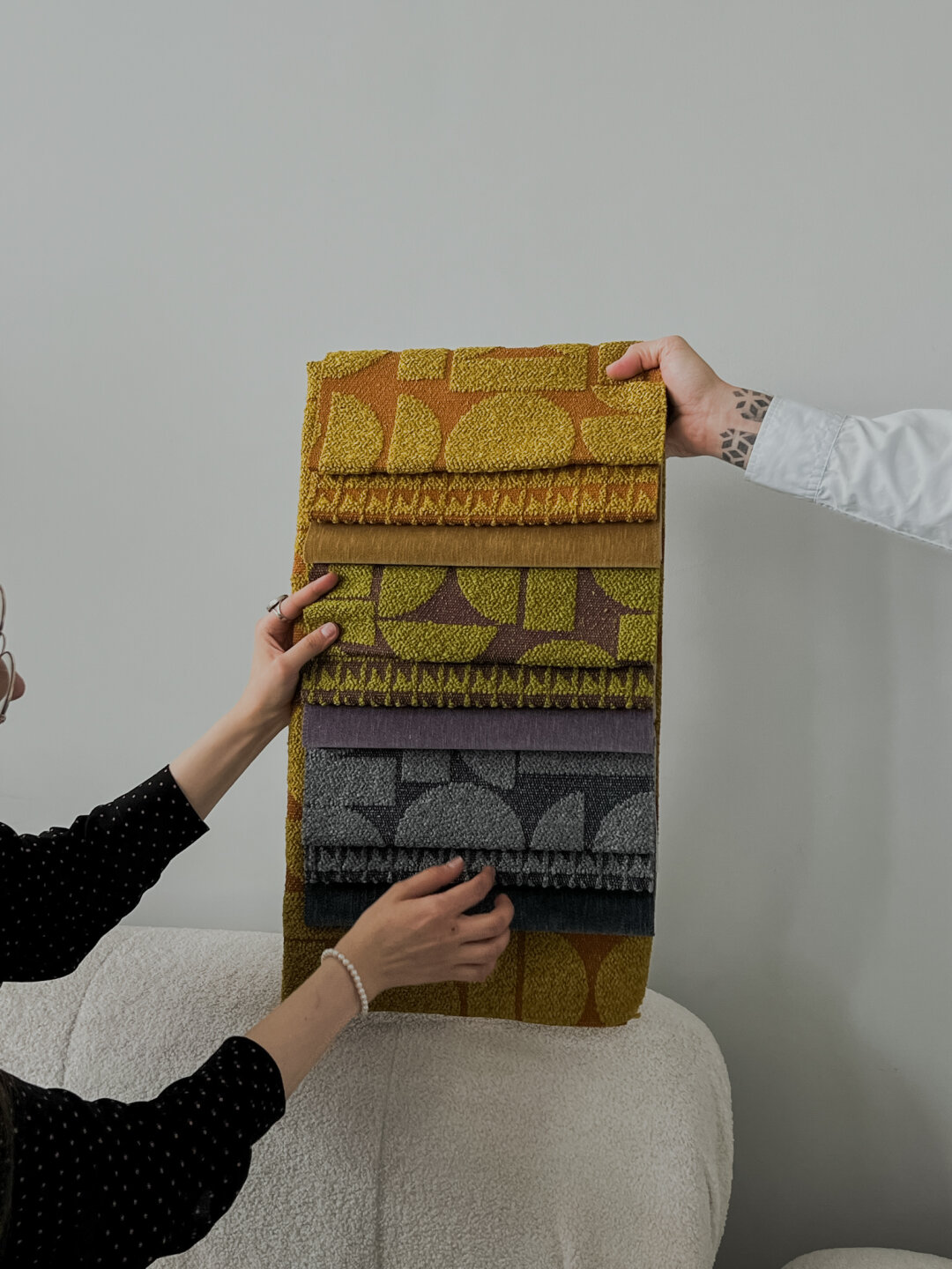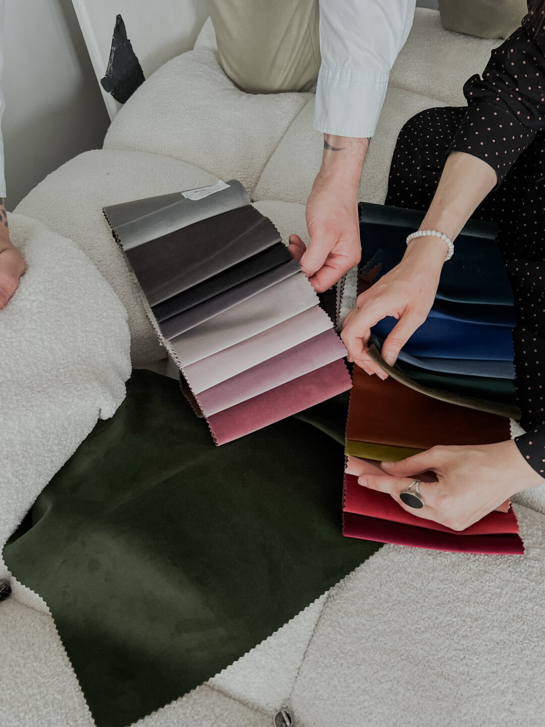 Следующий шаг — выбор ткани и обсуждение деталей. Цвет ниток, прострочка, декоративные элементы — все это мы показываем на образцах, потому что только так, можно увидеть, как ткань и отделка работают вместе.