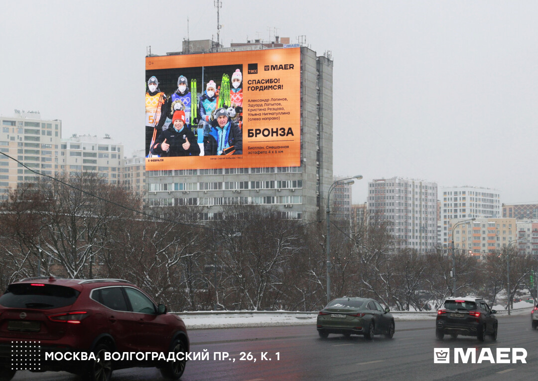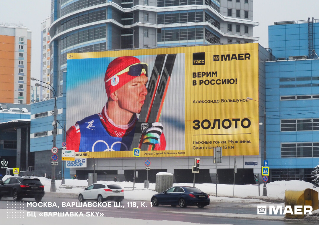 Россияне увидели своих чемпионов в беспрецедентном масштабе. С началом зимней Олимпиады-2022 фотографии призеров и победителей зимних Игр ежедневно транслируются на крупноформатных рекламных экранах медиахолдинга MAER. Проект поддержки российской сборной реализуется в Перми, Москве, Санкт-Петербурге, Сочи, Новосибирске, Челябинске, Екатеринбурге, Тюмени, Уфе, Самаре, Волгограде.