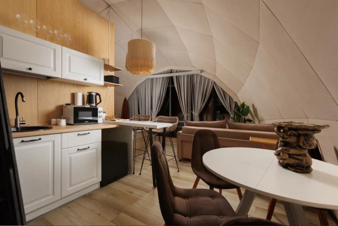 В этом году на территории парк-отеля появились уникальные домики — «Сферы» и «Панорама». Каждый из них оснащен по последнему слову техники: проектор и телевизор для киновечеров и всем необходимым для беззаботного проживания. Вишенка на торте — чан с подогревом на дровах и видом на живописное поле, который есть почти у каждого нового дома. Вечер, звезды, теплая вода и умиротворяющий пейзаж — что может быть лучше для перезагрузки?