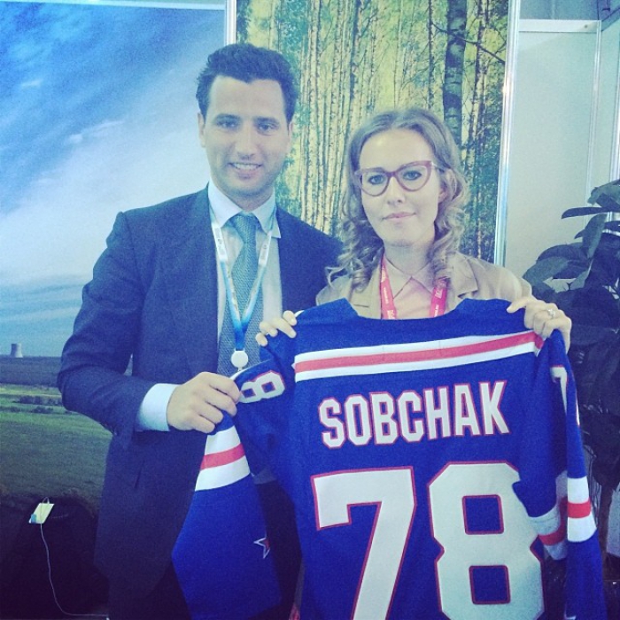 После интервью с Ксенией, вице-президент ХК СКА Роман Ротенберг решил приобщить Собчак к спорту и подарил форму с личным номером.