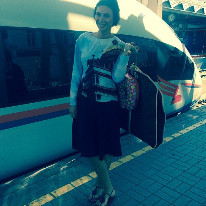 Главный редактор московского журнала также, как и Ксения Собчак, решила запечатлеть себя в пути прямо на платформе Ленинградского вокзала, сообщая подписчикам о визите на форум. На снимке Дарья появилась в платье с видами Петербурга молодого петербургского дизайнера Натали Лесковой.