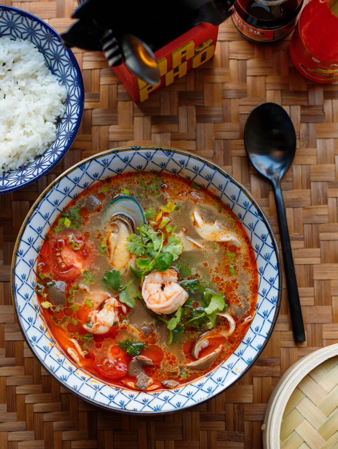 Украшение потолка Mr. Pho - тема для обсуждения уже не первую неделю. Двести девяносто три рыболовки из бамбука морем были доставлены из Хошимина в Новороссийск, а оттуда - в Ростов, уже по суше. Больше месяца понадобилась вьетнамским мастерам, чтобы сплести эти снасти. После того, как потолок сфотографирован в разных ракурсах, можно приступать к меню. Традиционный вьетнамский суп фо бо готовят здесь по всем правилам: из говяжьих костей и куриных тушек. Варится бульон восемь-десять часов, чем дольше - тем слаще он становится. Аромат ему придают специи: анис, кардамон, корица, гвоздика, кориандр. Сытный фо подаётся с зеленью, ростками пшеницы и соусом шрирача, с остротой которого лучше быть аккуратным. Блинчики Нэмы, спринг-роллы, пад тай, зелёный салат с манго, соба с говядиной в соусе «Хойсин», боул с креветками, том ям - абсолютные хиты Mr. Pho. Плюс здесь варят настоящий кофе по-вьетнамски, со сгущенным молоком.